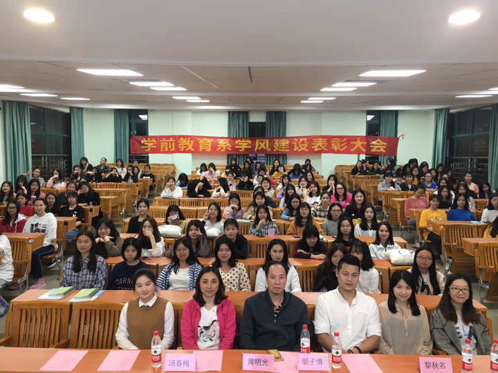 2019年3月19日晚上,学前教育系学风表彰大会在博C101举行。本次活动出席的嘉宾有学前教育系黄明光主任、学工助理罗琦琪老师、宿管科汤春梅老师、学前教育系邹子博老师、黎秋名老师、韩双苑老师以及学前教育系全体同学。
