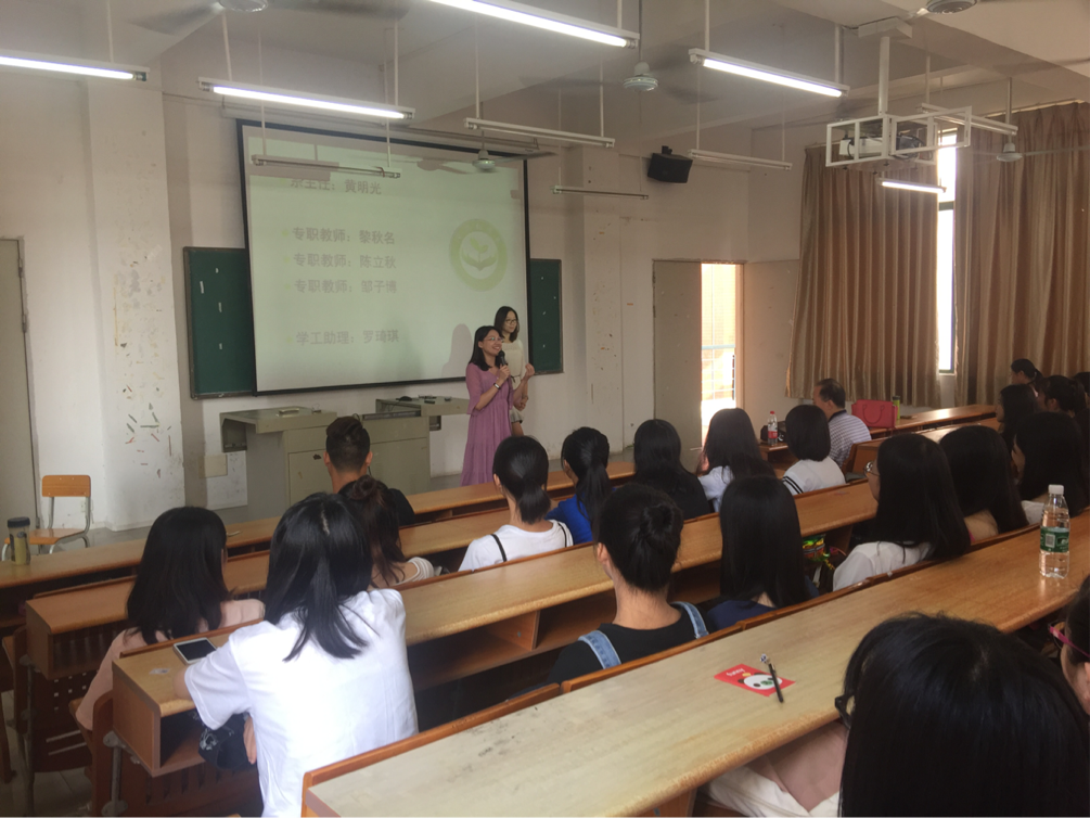 学前教育系于2018年9月9号上午8点30分在博B301召开师生见面会。首先是学工助理罗琦琪老师介绍莅临本次会议的教授及老师,分别是系主任黄明光教授、专职教师黎秋名老师、专职教师陈立秋老师、专职教师邹子博老师、学工助理罗琦琪老师。