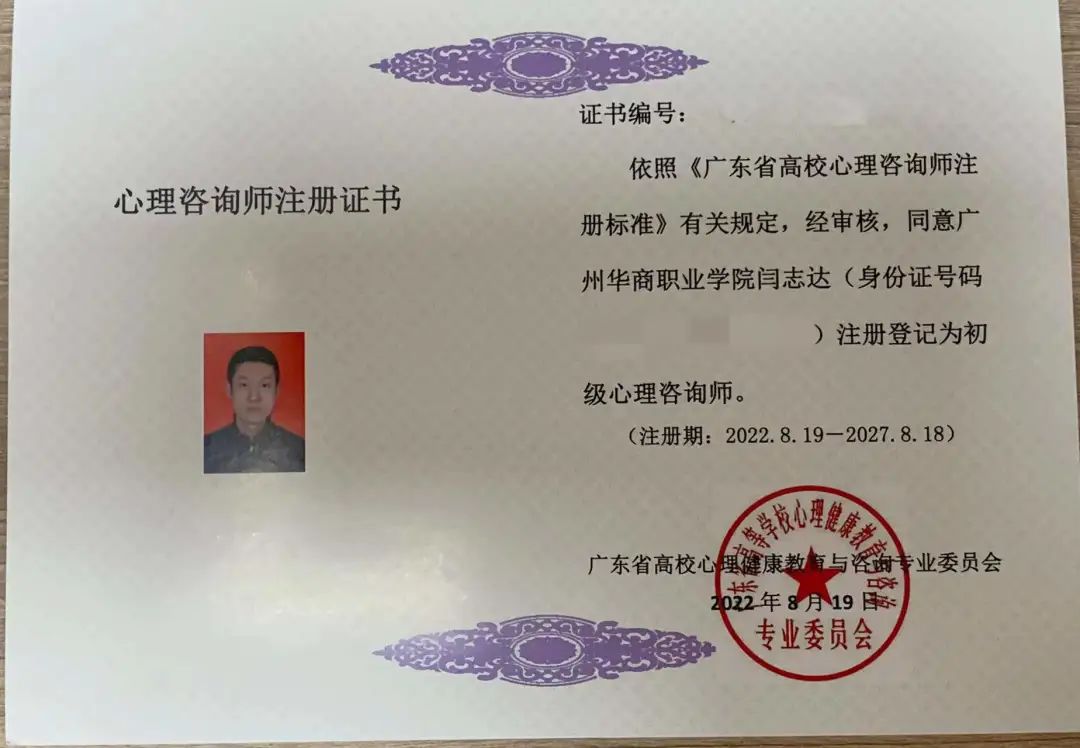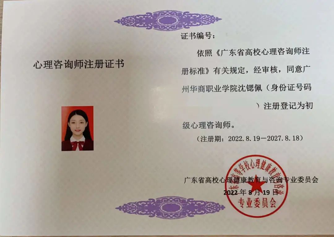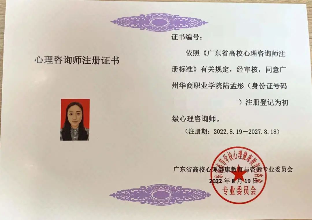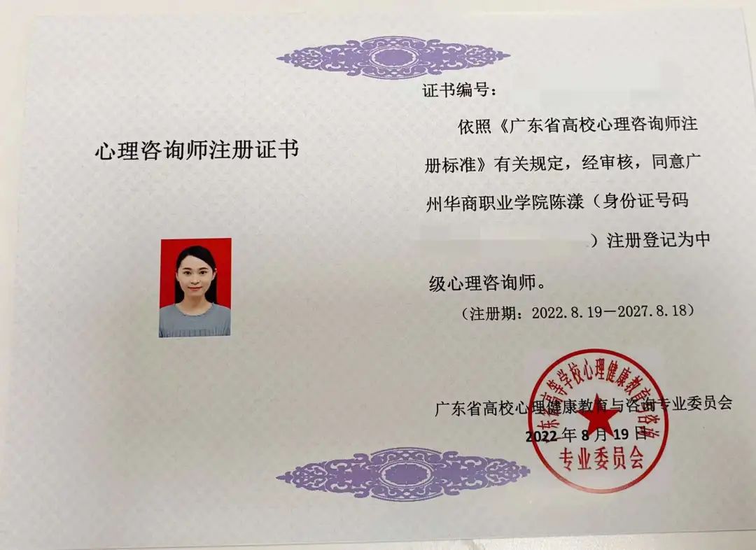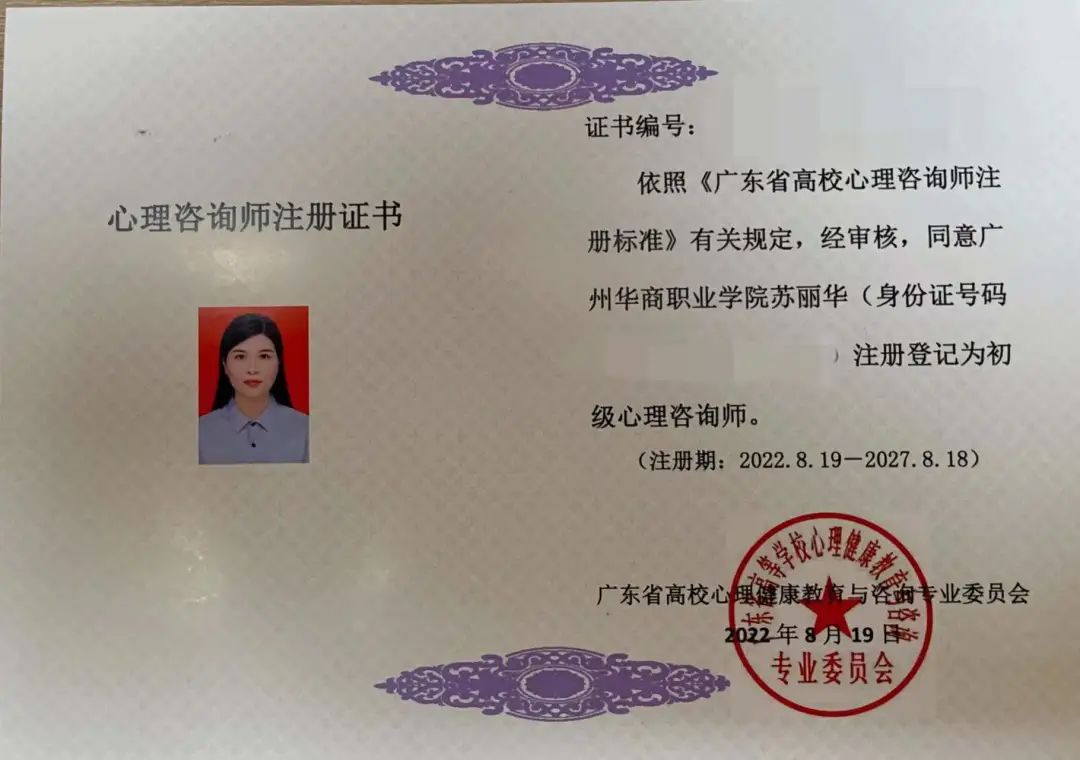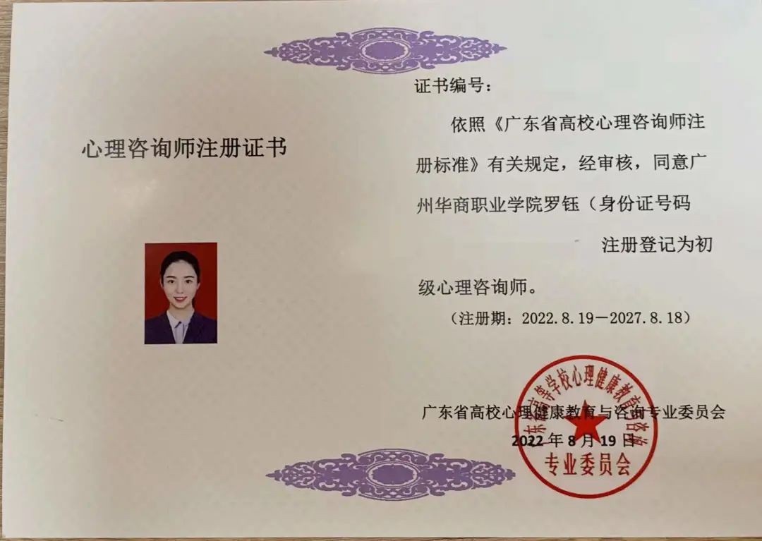 教育与艺术学院二级心理辅导站获得广东省高等学校心理健康教育与咨询专业委员会(以下简称“高心委”)颁发的广东省高校注册心理咨询师证书。其中,二级辅导站全体教师通过了广东省心理咨询师注册认证,其中1位老师获得了“中级心理咨询师”证书,5位老师教师获得了“初级心理咨询师”证书。