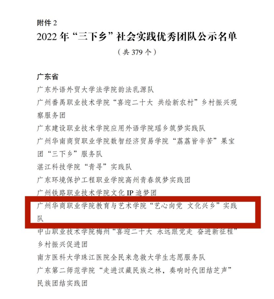 近日,为深入总结交流经验、选树典型宣传、推动引领示范、激励广泛参与、发挥育人实效,团中央通报表扬一批在2022年“三下乡”社会实践活动中表现突出的优秀集体、个人和项目,并通过新媒体平台广泛进行典型事迹做法宣传。在本次活动中,经基层申报、省级团委审核推荐、组织评议等环节,广州华商职业学院教育与艺术学院“艺心向党 文化兴乡”实践队荣获2022年全国“三下乡”社会实践优秀团队,这也是我校首次取得全国“三下乡”社会实践活动优秀团队,强势冲进广东省前列,进入全国评选,拿到有史以来的最好成绩。