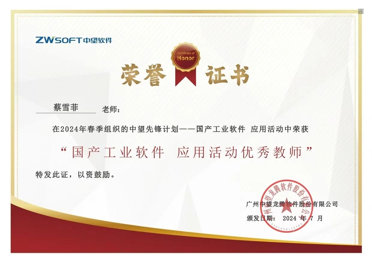 在数字化转型的时代背景下,国产信息技术、产品与教育的深度结合已成为一种不可逆转的趋势。广州中望龙腾软件股份有限公司正式发布了春季国产工业软件应用推广表彰名单,其中,广州华商职业学院被授予了“标杆院校”的荣誉称号,同时,建筑与艺术学院蔡雪菲老师荣获了“国产工业软件应用优秀教师”的荣誉证书。
