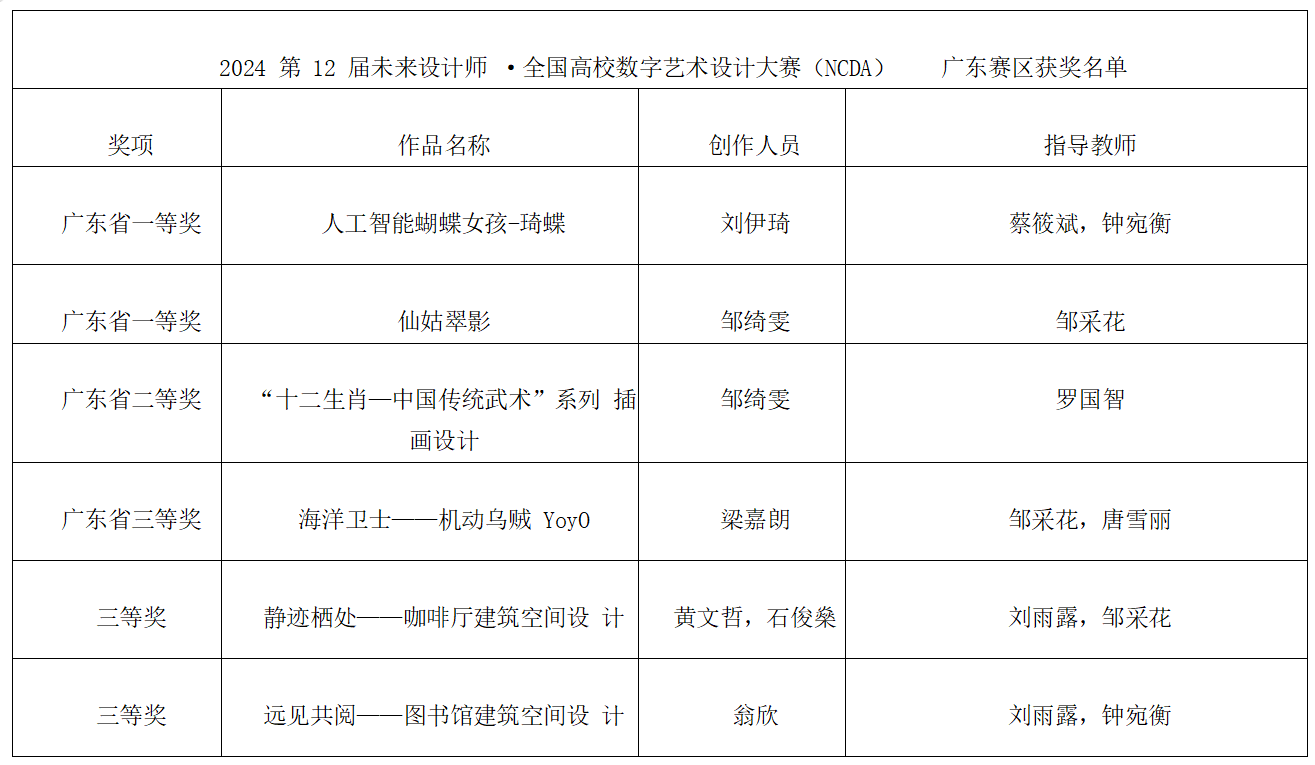 在2024年举办的未来设计师全国高校数字艺术设计大赛中,我校建筑与艺术学院学生表现出色,荣获全国赛三等奖1项、广东省赛一等奖2项、二等奖1项、三等奖3项。此外,教师蔡筱斌和钟宛衡荣获全国赛与广东省赛优秀指导老师奖,教师邹采花荣获广东省赛优秀指导老师奖。