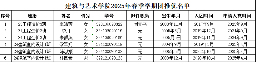 团支部推优大会是团组织向党组织推荐优秀共青团员作为党组织发展对象的重要途径,是新时期团组织发挥党的助手与后备军作用在政治上的最高体现,也是共青团组织发挥育人作用的体现。经我院个人申请、各班级团支部选拔、团推优工作小组审核查,最终推荐产生下列6名团员作为团推优对象,具体名单如下: