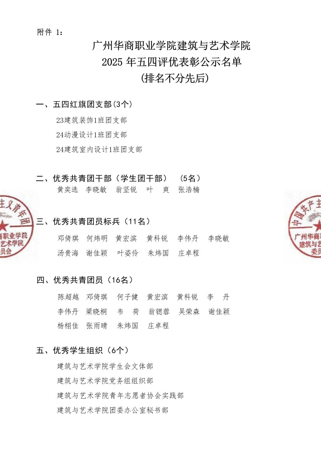 为深入贯彻习近平总书记关于青年工作的重要思想,充分发挥共青团组织和团员青年的先锋模范作用,进一步弘扬“五四”精神,塑造典型和树立榜样,营造良好的校园氛围,激发同学们争做先锋的活力,根据《建筑与艺术学院关于做好2025年“五四”评优表彰工作的通知》(建艺团〔2025〕2号)文件要求, 积极开展广州华商职业学院建筑与艺术学院2025年五四评优表彰工作。经我院学子积极申报,由各团支部初审,院团委复审,院五四评优小组终审,并报学院党总支审查通过,广州华商职业学院建筑与艺术学院2025年五四评优表彰评选现已全部结束。现将广州华商职业学院建筑与艺术学院2025年五四评优表彰结果公示,拟授奖项如下: