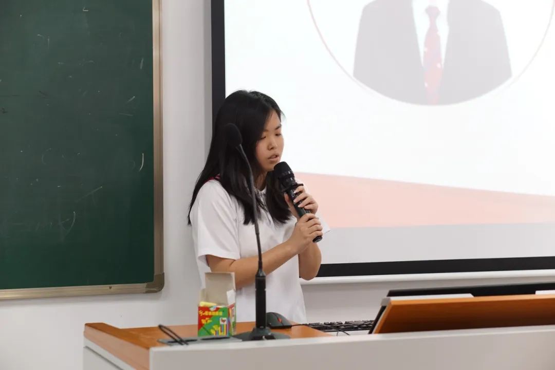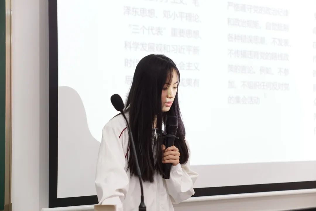 学生第二党支部书记熊嘉丽在入党积极分子汇报后进行总结发言。她首先肯定积极分子准备和汇报,强调入党积极分子们要继续加强政治理论学习,将党的理论内化于心,外化于行;在学业上持之以恒,发挥模范作用,带动身边同学共同进步;在志愿服务中不忘初心、全心全意为人民服务,积极主动为同学们排忧解难。