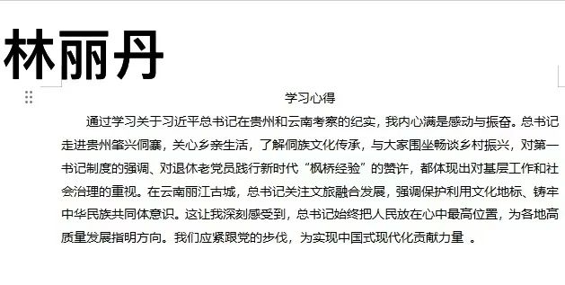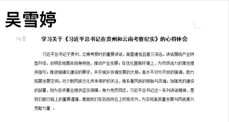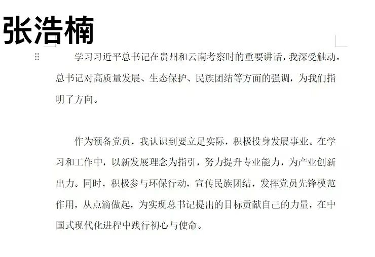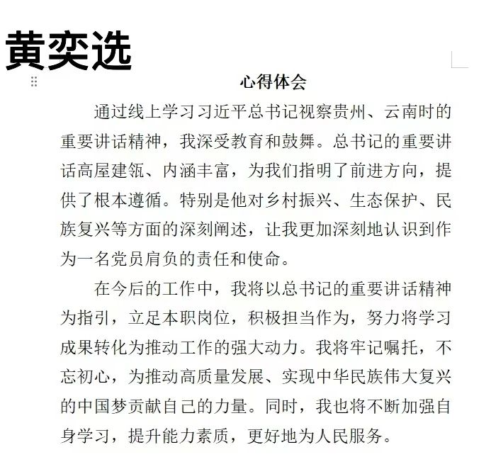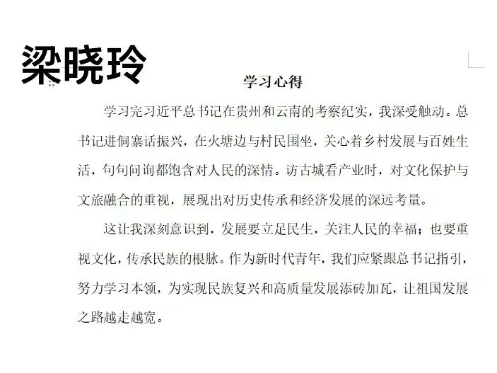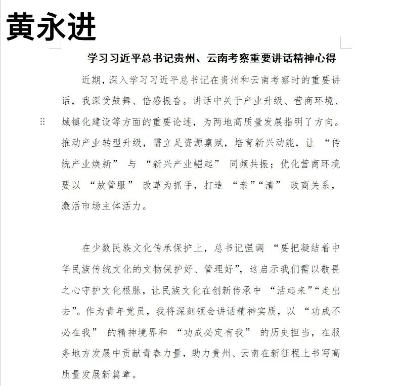 习近平总书记在贵州、云南考察时的重要讲话精神,为青年党员指明了“向下扎根、向上生长”的奋斗方向。作为新时代学生党员,我们当以总书记的殷切嘱托为航标,将理论学习与实践担当深度融合:在乡村振兴中锤炼党性,以专业知识助力特色产业升级;在生态保护中践行“两山”理念,用青春守护绿水青山;在文化传承中焕发创新活力,让民族瑰宝绽放时代光彩。站在新的历史节点,我们更需牢记“把论文写在祖国大地上”的初心,以“时时勤拂拭”的自觉锤炼作风,将基层实践的“问题意识”转化为服务国家战略的“破题之力”,用脚步丈量责任,以实干诠释忠诚。