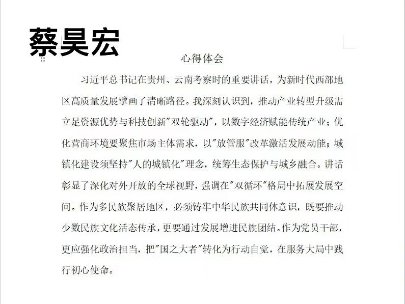习近平总书记在贵州、云南考察时强调,要坚持以高质量发展统揽全局,深化改革开放,推动民族地区现代化进程,筑牢中华民族共同体意识,以党建引领乡村振兴和文化传承。总书记的殷殷嘱托饱含对民族地区的深切关怀,为新时代青年党员指明了奋斗方向——以实干担当践行初心,以创新思维赋能发展,让青春在服务国家战略中绽放绚丽之花。