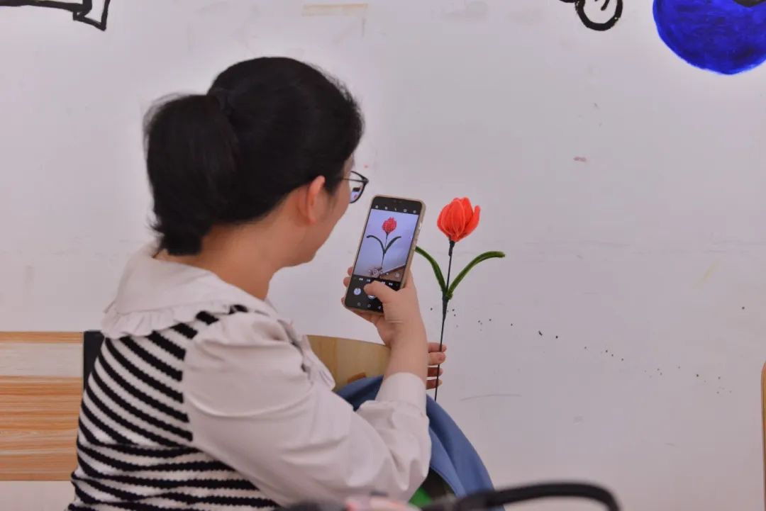 活动高潮部分,家长和孩子们共同参与手工制作。妈妈们可以选择制作手工花或手串,志愿者们在一旁耐心指导,帮助大家完成作品。在制作过程中,孩子们与妈妈们亲密互动,现场氛围温馨而融洽。