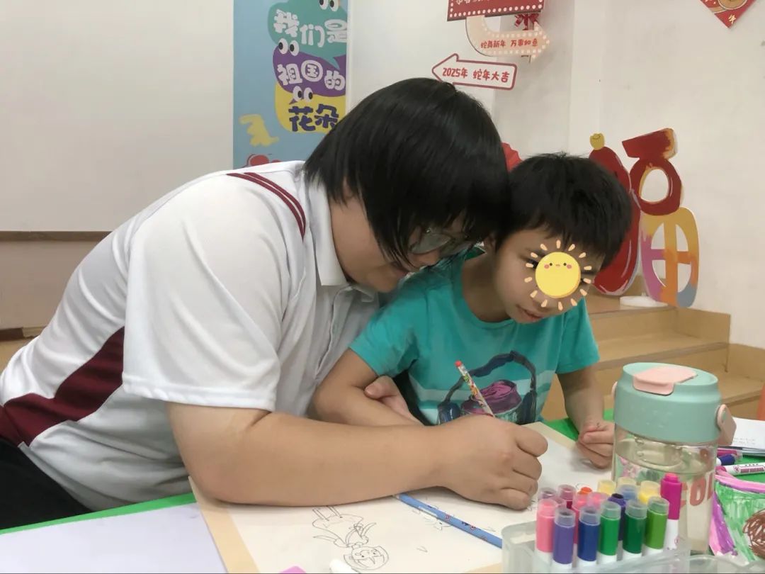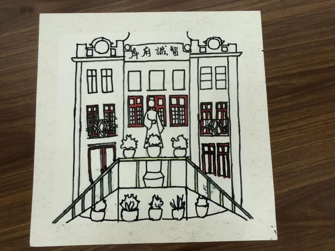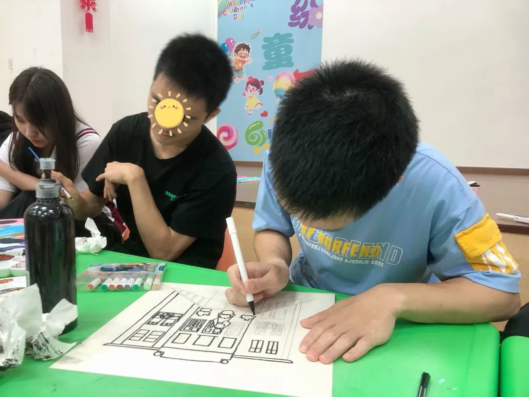 活动当天,志愿者按时抵达新会儿童福利院。稍作准备后,便迅速投入到教学中。上午,志愿者们以“新会景堂图书馆”为绘画主题,向孩子们介绍这座承载着丰富知识与文化底蕴的建筑。志愿者们耐心地指导孩子们观察建筑的外形、结构和色彩,从简单的线条勾勒开始,一步一步引导孩子们将心中的图书馆呈现在画纸上。