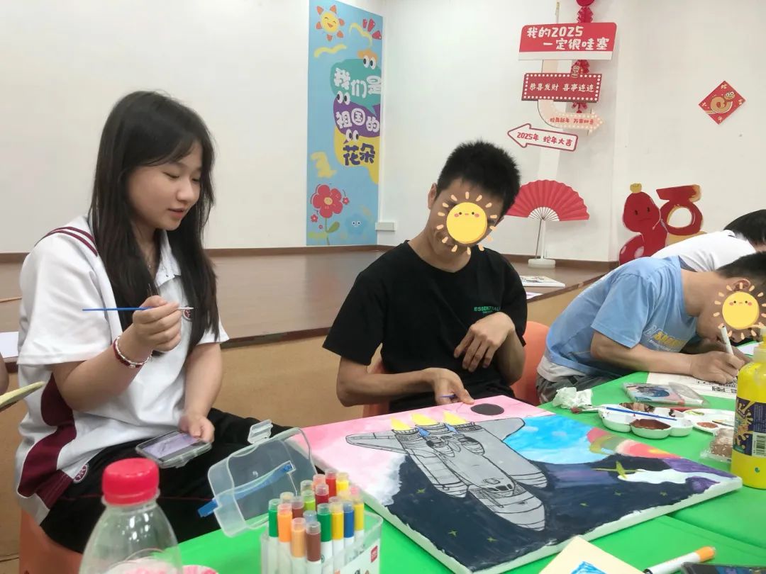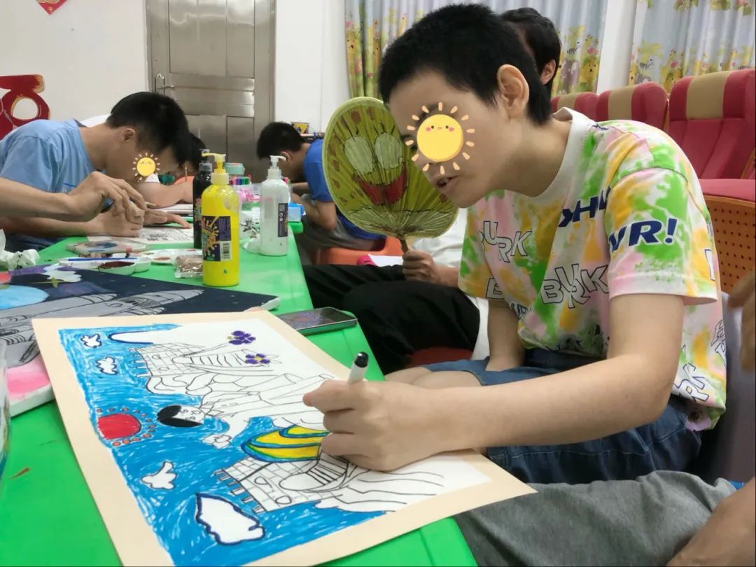 下午,志愿活动继续进行,此次的绘画主题是富有地方特色的名人蒲扇。志愿者们向孩子们讲述新会名人故事,让孩子们在了解家乡文化的同时,将名人形象和特色元素绘制在蒲扇上。绘画过程中,志愿者与孩子们围坐在一起,手把手教学,鼓励孩子们大胆发挥想象,用色彩装点蒲扇。孩子们全神贯注,将自己的创意融入画作,现场氛围温馨而热烈。