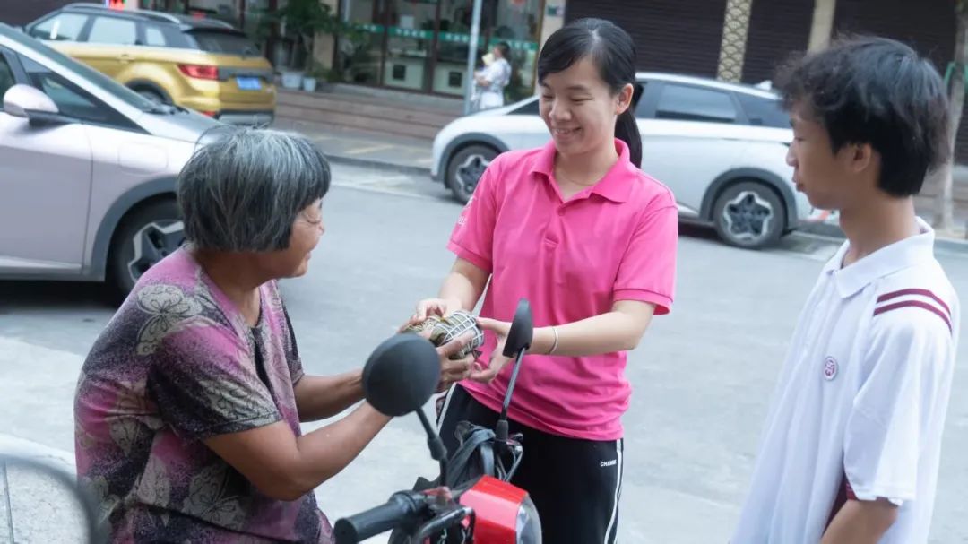 与此同时,另一组党员、入党积极分子志愿者们将包好煮熟的粽子送往学校,为同学们送上节日的问候。在校园里,同学们好奇又兴奋地接过粽子,并在便利贴上写下端午祝福,粘贴在墙上。
