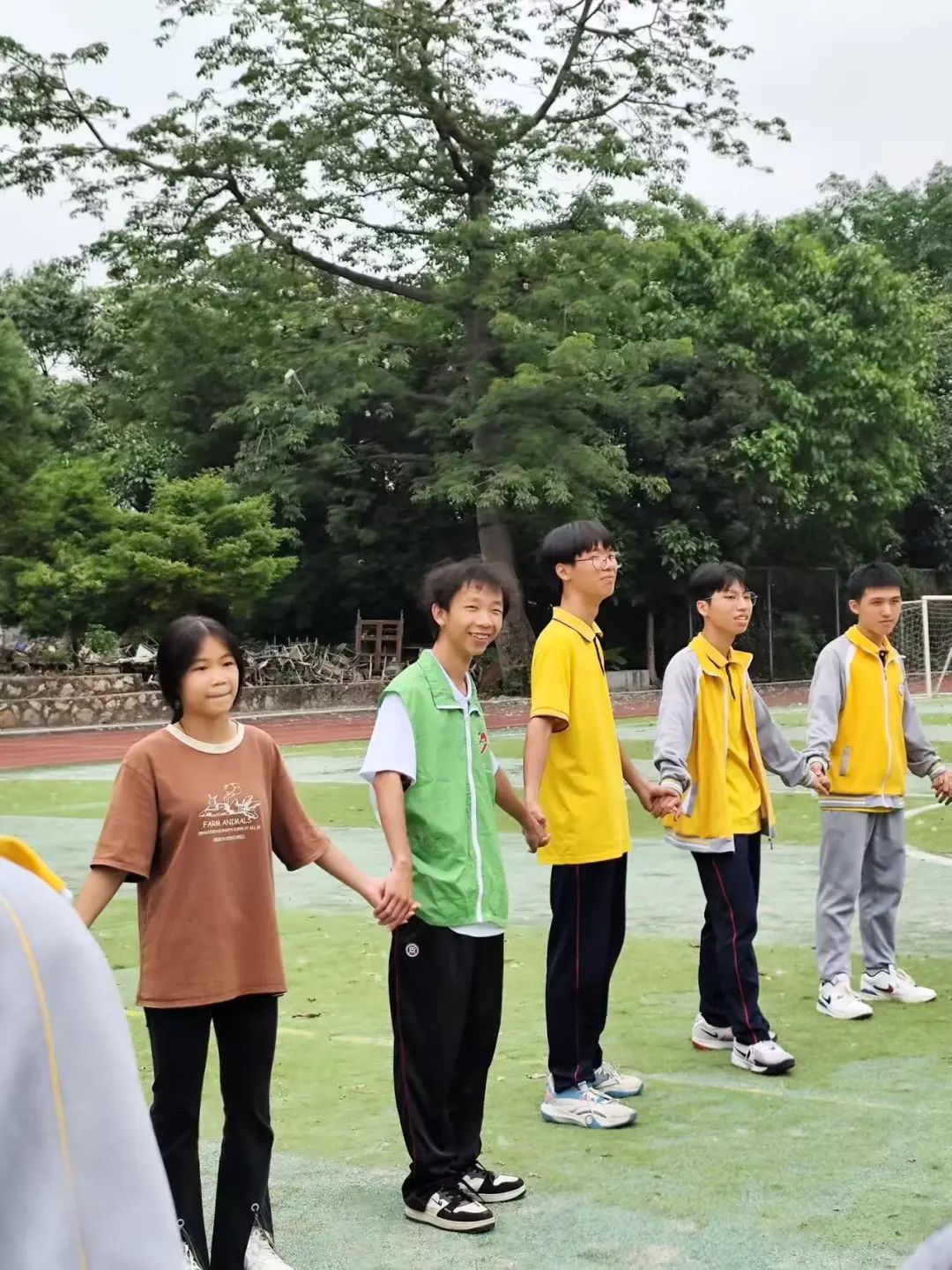 在“一面到底”游戏中,同学们手牵手围成紧密的圆圈,在双手始终不松开的规则限制下,展开了一场紧张又有趣的挑战。随着志愿者一声令下,大家迅速行动起来,通过巧妙扭动身体、默契配合传递呼啦圈。从第一名同学开始,呼啦圈在队伍中不断穿梭,成员们齐心协力,努力寻找最佳传递方式,挑战自我极限。在传递过程中,大家互相鼓励、相互配合,不仅展现了个人灵活应变的能力,更培养了团队协作精神,现场气氛热烈而充满活力。