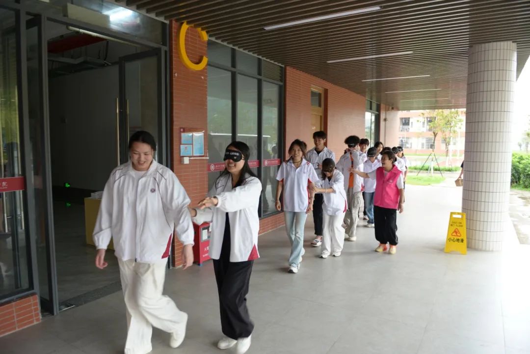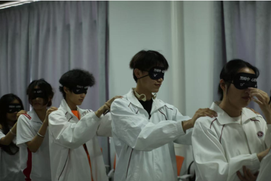 其中,情景剧体验和路线挑战将活动推向高潮。同学们在戴上眼罩后,在仅有一名学生单人领跑员的协助下,尝试完成指定路线。在黑暗中,每一步都充满未知与忐忑,他们不仅要克服内心的恐惧,还要依赖领跑员的引导和自身对环境的感知来前行。这一过程,让同学们对无障碍环境建设的重要性有了更为深刻的理解,激发了他们关注并积极投身于无障碍环境建设的热情,希望为视障群体创造更加友好、便捷的社会环境。