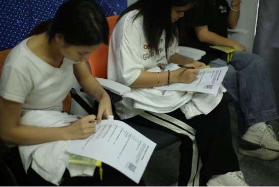 随后,进入到本次活动的关键环节——沉浸式黑暗体验。在导师的指导下,同学们进行了一系列沉浸式体验活动,如使用视力胶片体验有代表性的疾病模拟视力障碍、触摸盲文,并佩戴眼罩蒙着眼睛在黑暗中行走,沉浸式体验视障人士在日常生活中的真实感受。