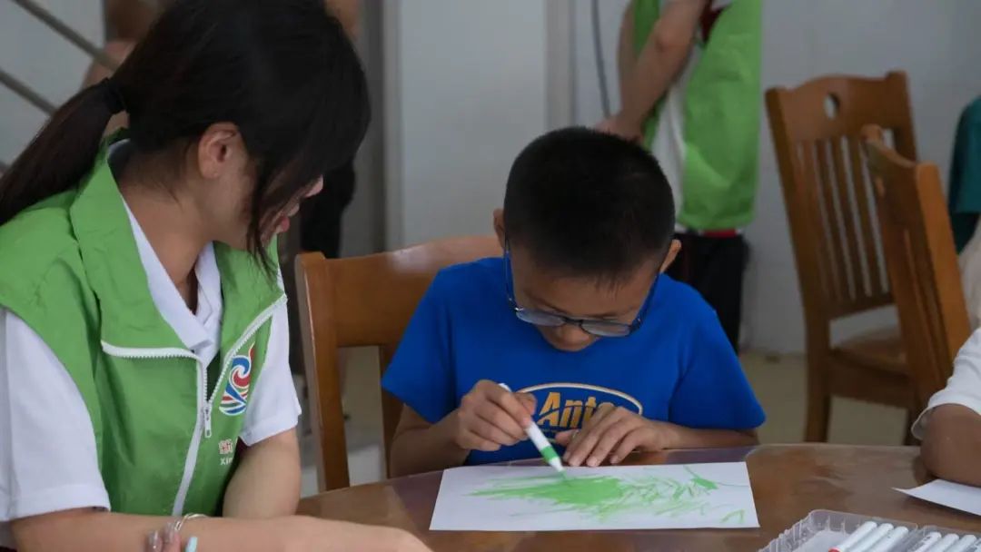 在创意实践环节,志愿者充分发挥建筑与艺术专业特长,设计并指导绘画与黏土场景搭建活动。绘画环节中,志愿者引导小朋友用画笔描绘理想的候鸟生存环境,从构图、色彩搭配等专业角度给予指导,将环保理念融入艺术创作;