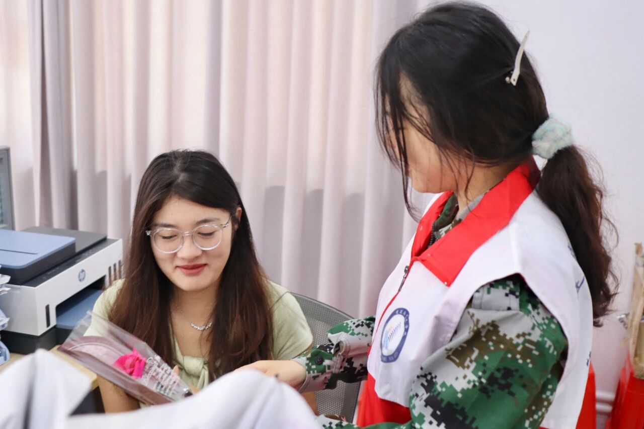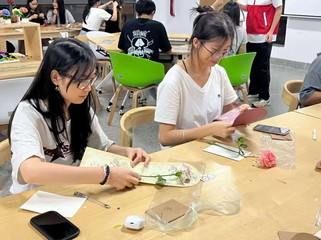 在花束制作过程中,支部入党积极分子化身“花艺指导”,手把手向同学们传授技巧。同学们领取提前备好的花材与工具后,跃跃欲试地投入创作:有的在花束中加入手写的小卡片,写上专属祝福;还有的用彩绳编织装饰,让花束更显独特。从生疏地整理花杆到熟练地系结丝带,每一束花束都融入了满满的心意,大家互相展示成果、交流创意,现场不时传来阵阵欢笑与称赞,现场氛围热烈而温馨。