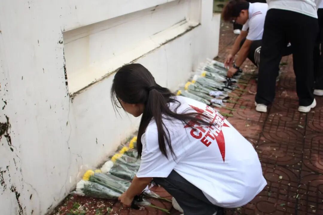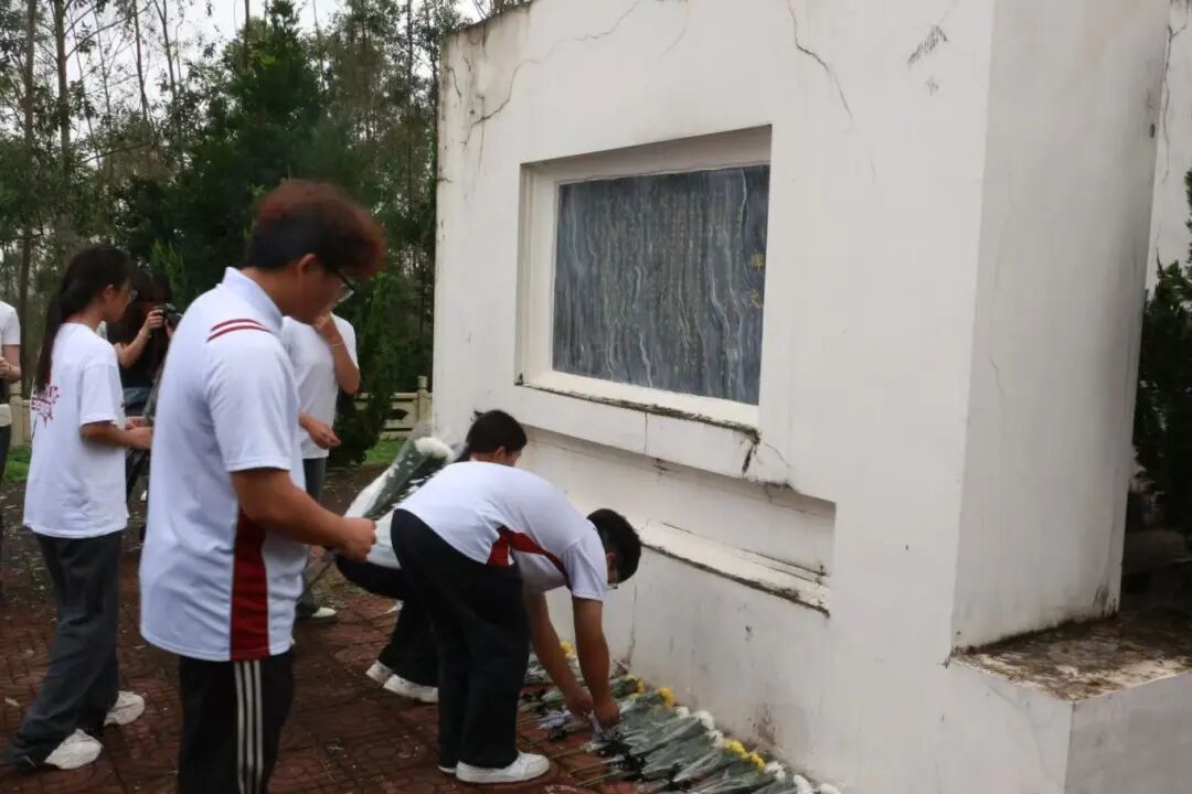 在庄重的氛围中,献花环节有序开展。师生们手持白菊花、黄菊花,缓步走向烈士纪念碑,将鲜花轻轻置于碑前,随后鞠躬致意。每一朵鲜花都承载着对英烈的深切缅怀,每一次鞠躬都饱含着传承使命的坚定决心,这一简单而庄重的举动,正是对 “崇尚英雄、捍卫英雄、学习英雄” 的生动践行。