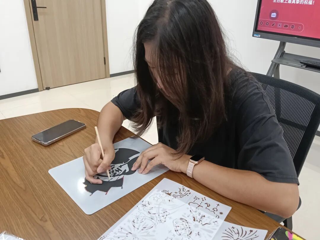 作为视觉传达设计专业的特色实践环节,创意刮画成为本次活动的亮点。团员们手持刮画笔,在墨色涂层纸上细细勾勒——天安门的巍峨轮廓、飘扬的五星红旗、璀璨的节日烟花等元素渐次显现,原本单调的黑色卡纸蜕变为一幅幅绚丽多彩的爱国画卷。创作过程中,团员们相互交流技法、分享灵感,将专业所学与爱国情感紧密结合,每一道线条都凝聚着对祖国的深情祝福,每一抹色彩都彰显着青春的蓬勃力量。