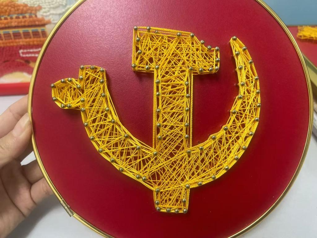 创作现场,党员们专注投入、默契协作。测量钉距时分毫必较,固定铁钉时稳扎稳打,缠绕丝线时反复调整——每一颗铁钉都承载着对先烈的敬仰,每一根丝线都串联着对历史的铭记。有的以炽热红为主调,勾勒祖国的疆土;有的将党徽与和平鸽融入画面,传递“以战止战、珍爱和平”的深层寓意。指尖翻飞间,冰冷的铁钉与柔软的丝线碰撞出艺术火花,抽象的红色记忆转化为具象的视觉作品。