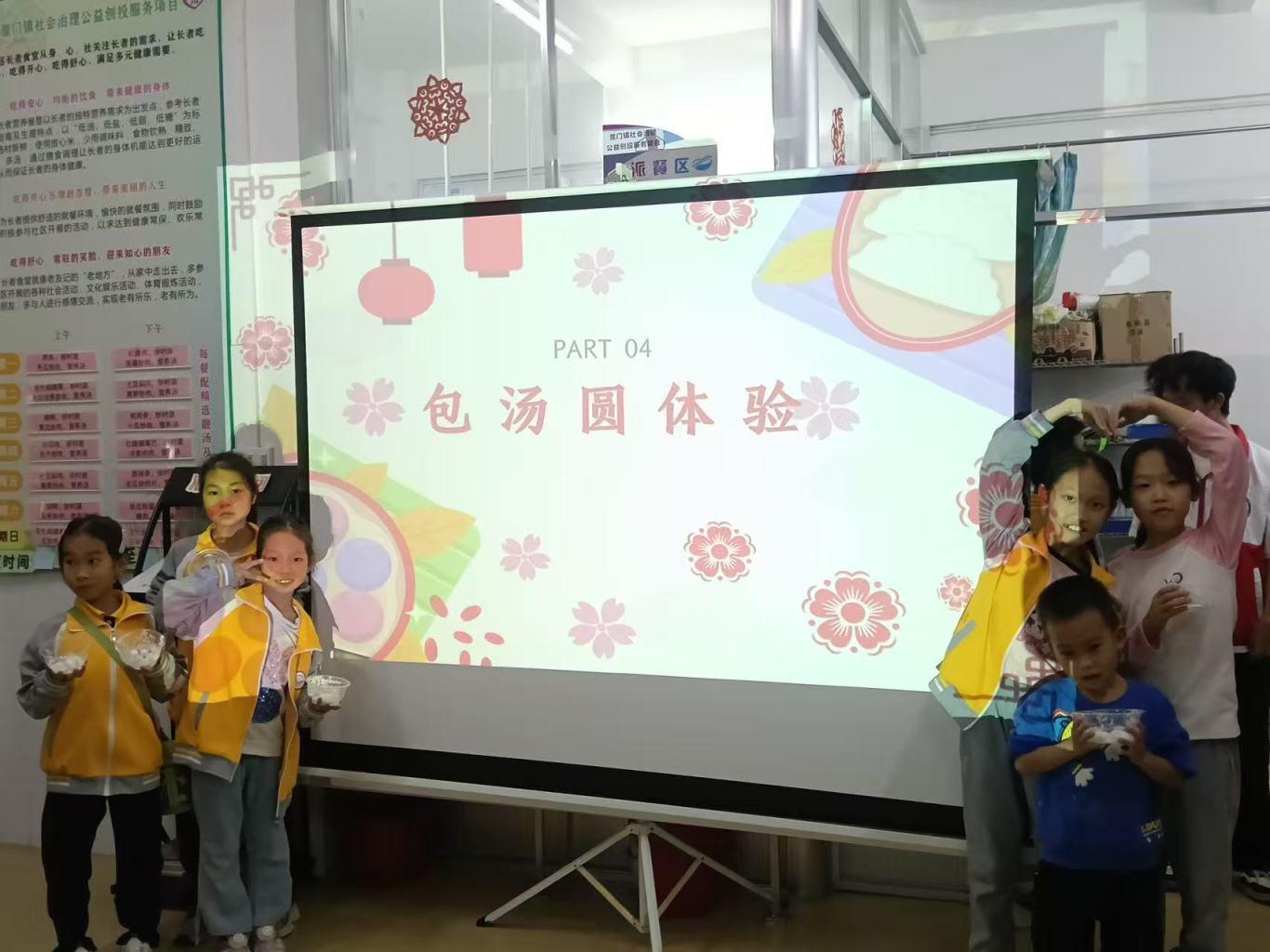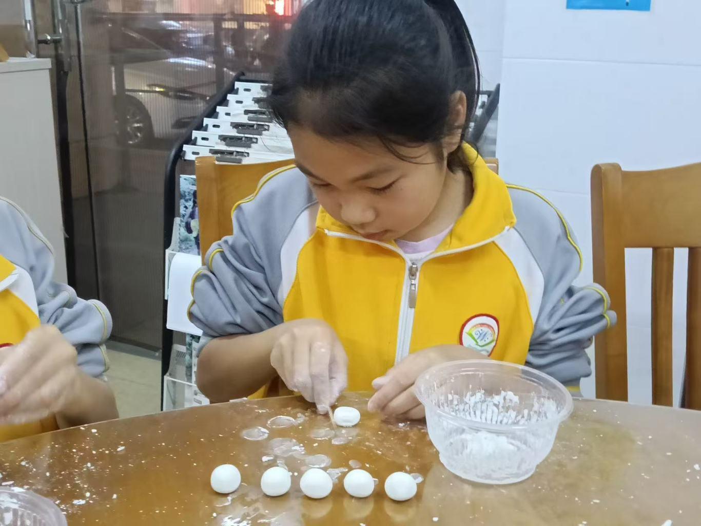 随后,包汤圆体验环节欢乐开启。志愿者们耐心示范包汤圆的手法,手把手指导孩子们将面团搓圆、按压、填馅、封口。孩子们学得有模有样,一个个形态各异的汤圆在小手中渐渐成型,现场洋溢着童真童趣。