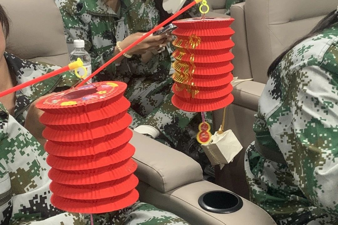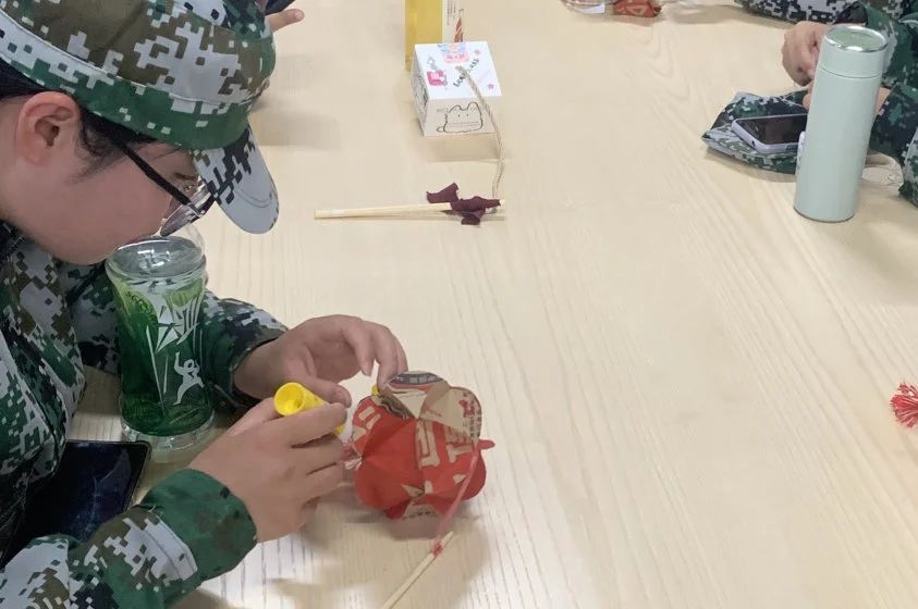 随后,教官和同学们一同动手制作手工灯笼,大家边做边聊,现场充满了欢声笑语。在同学们灵巧的双手下,一盏盏色彩斑斓、寓意吉祥的精美灯笼呈现在大家眼前。看着自己的作品,同学们脸上洋溢着满足的笑容,纷纷举起灯笼,展示着自己的劳动成果。