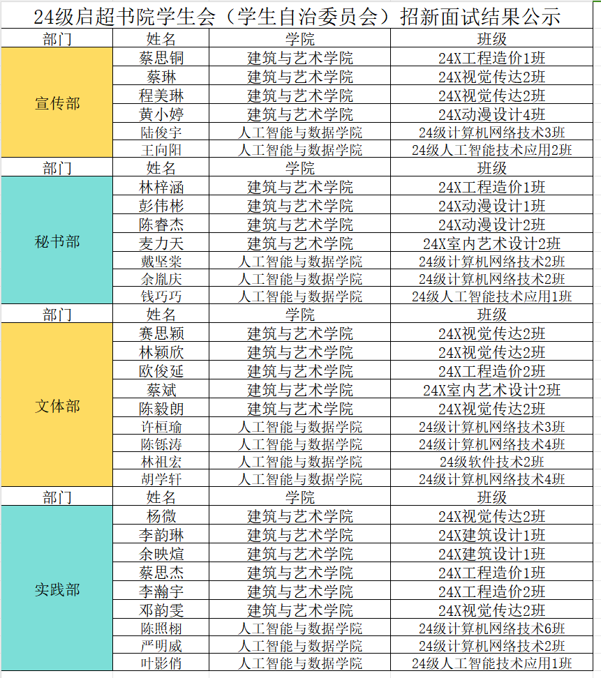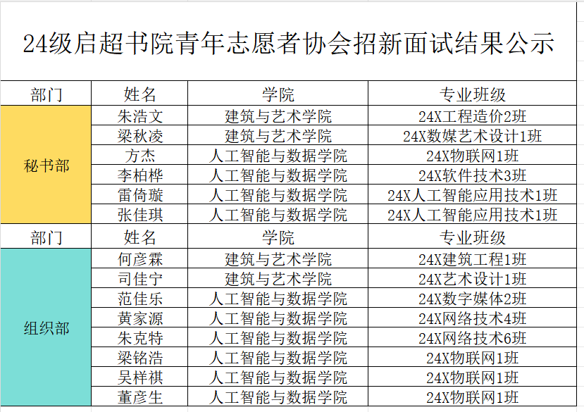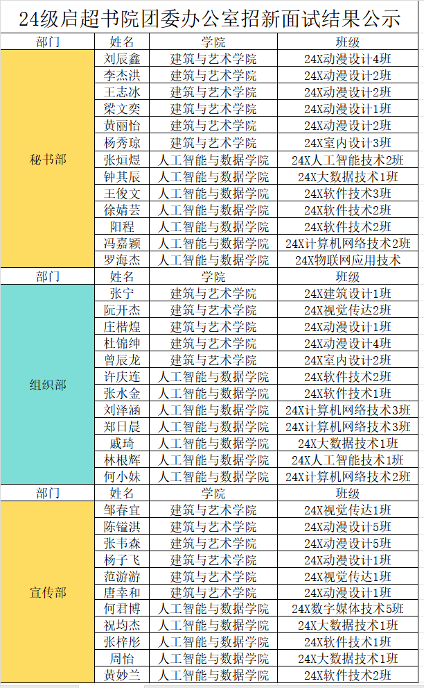 经过一系列严谨而公正的面试,部门负责人秉承着公平公正的态度,最终确定了新一届启超书院团委实习成员名单,现将通过面试名单公布如下: