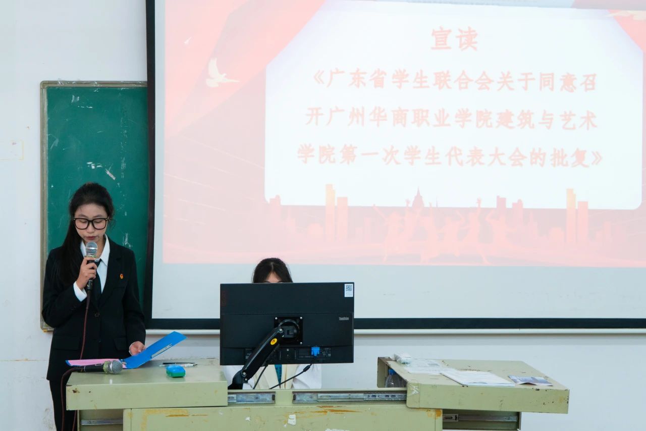 大会工作人员李晓敏宣读《广东省学生联合会关于同意召开广州华商职业学院建筑与艺术学院第一次学生代表大会的批复》。