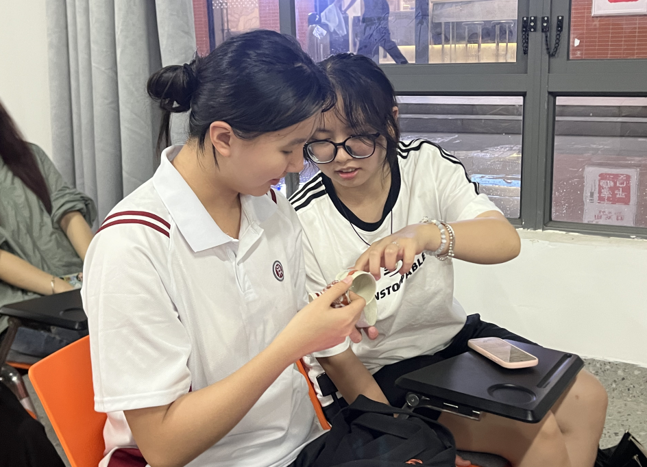 紧接着,林景然老师展示了几件珍贵的陶瓷实物让大家近距离观赏,温润的釉色折射出其独特的气韵,同学们小心翼翼地亲手触摸这些跨越历史长河而来的瓷器,不时地发出低声赞叹,每一个人都感受着源远流长的中华文明在指尖流淌。