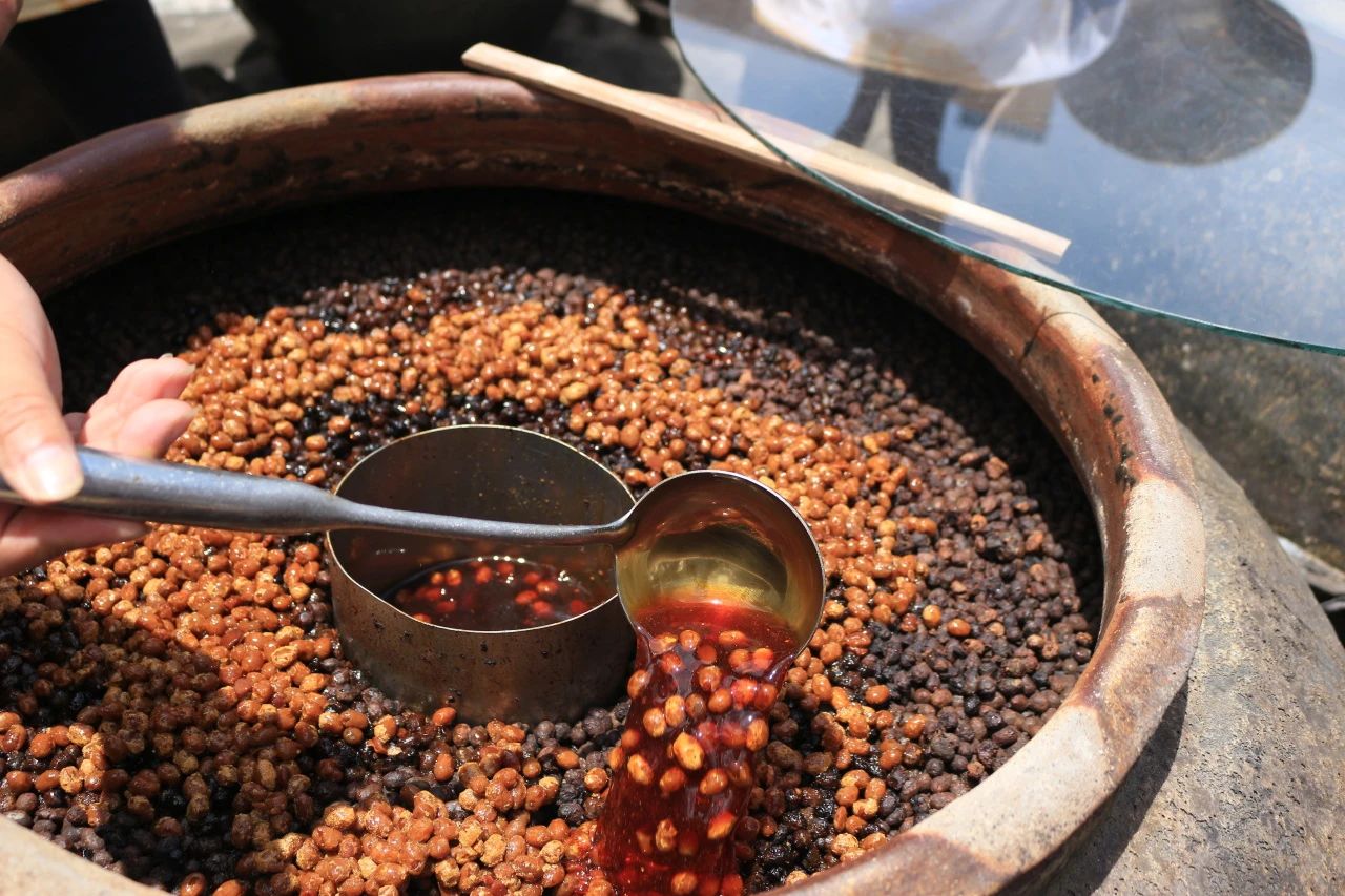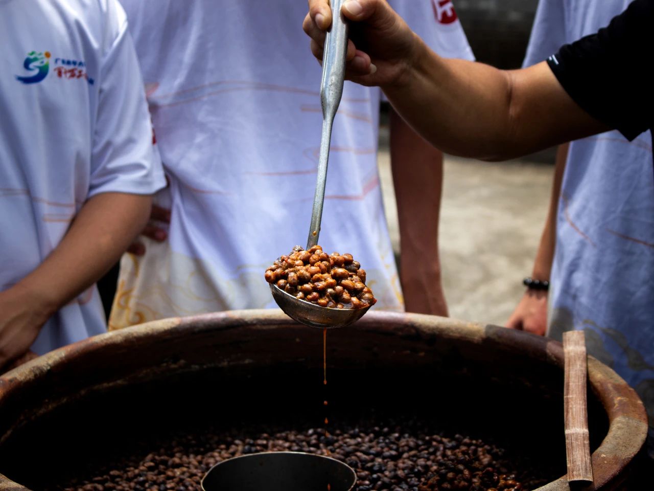 随后,我们踏入了酿造基地的核心地带,映入眼帘的是无数排列整齐的巨大酱缸,它们静静地诉说着岁月的故事,见证了180天的日晒雨淋,黄豆在这里接受阳光的洗礼,逐渐转化成滴滴醇香。负责人耐心地解说了酿造的每一道工序,从黄豆的精挑细选、蒸煮处理,到制曲发酵的微妙变化,每一步都凝结着匠人们的心血与智慧,让队员们对豉油的制作过程有了直观而深刻的感悟。
