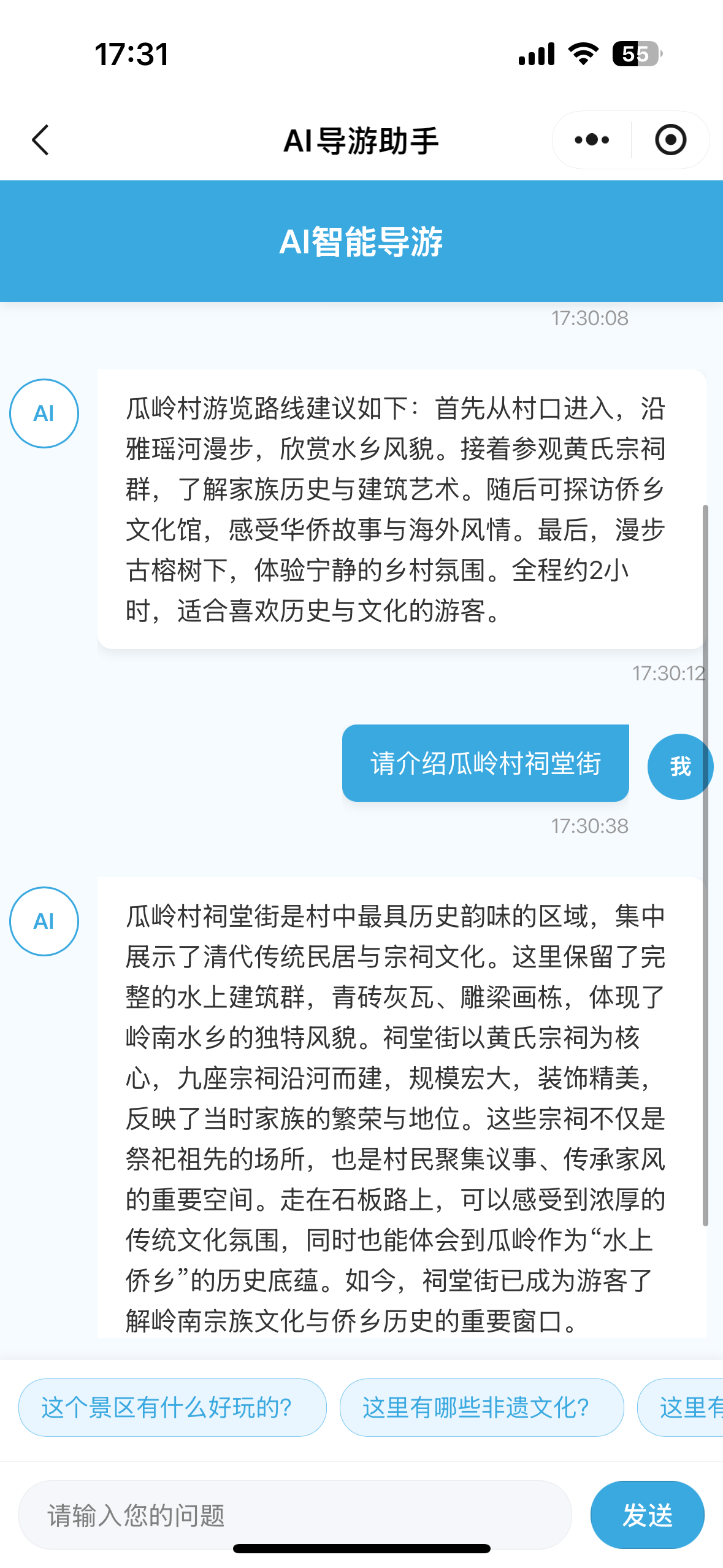 且小程序融入大语言模型,团队建立瓜岭古村本地的结构化知识库,融入高效的“检索-生成”机制,系统会首先从本地的结构化知识库中精准调取信息,再输出智能导览内容。这种“先检索、后生成”的RAG模式,既避免了通用模型可能出现的信息偏差,又能借助大语言模型让每一段讲解都生动易懂,真正成为你探索古村的专业向导。