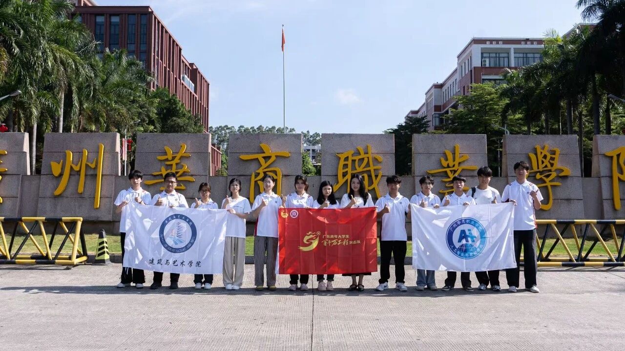2025年7月7日,清晨的阳光洒满校园,出征的旗帜迎风飘扬,匠心筑梦突击队全体成员在华职校门口进行合影留念,合影结束后成员们开始整理各自的行囊,团队成员腰挎相机,手拿旗帜,心怀信念和满腔热情,开始奔赴瓜岭村实践地,奔赴筑梦高要。