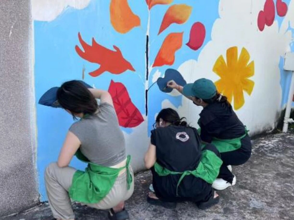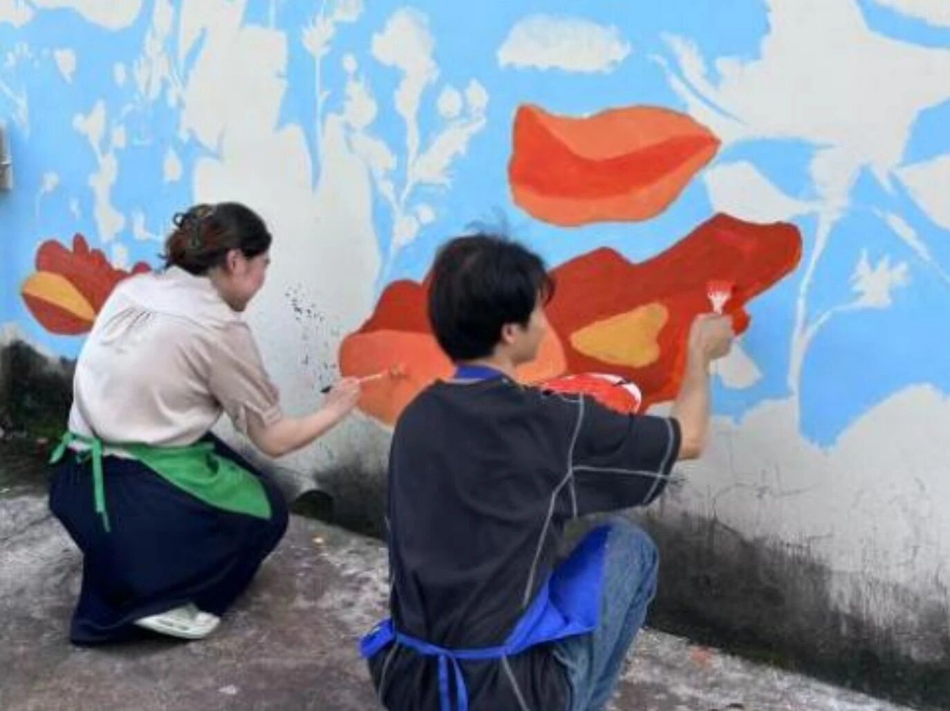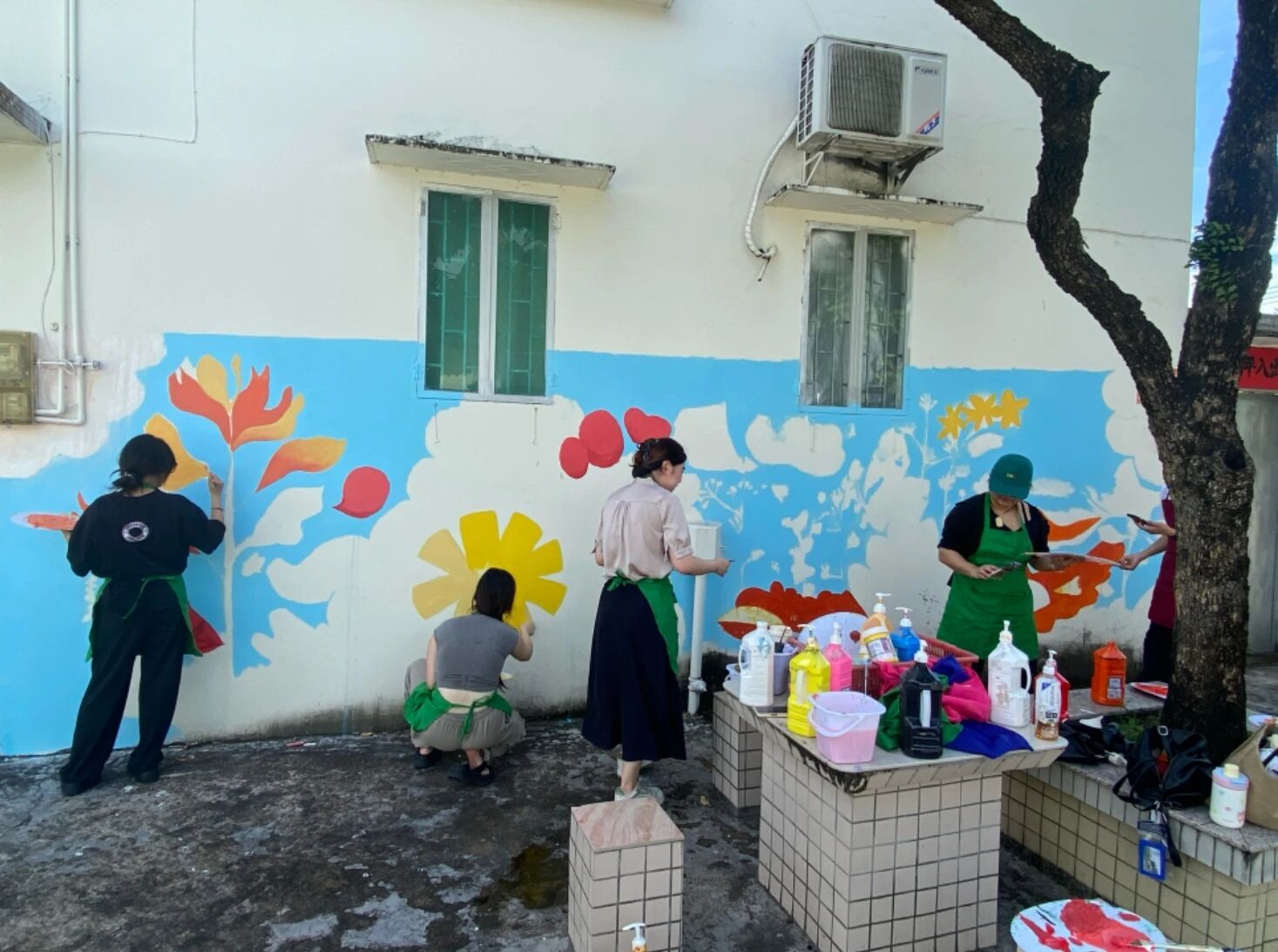 正午刚过,气温便直逼35度,地面蒸腾的热气与头顶的烈日,将墙面烘烤得发烫。即便如此,团队成员依旧迅速投入工作。大家先将调配好的颜料仔细分装,不同色调对应着设计图上的各个区域。戴着草帽、手持滚筒和画笔,开始在已经勾勒好轮廓的墙面上上色。汗水顺着脸颊不断滑落,滴落在颜料盘里,却丝毫没有影响我们的专注。