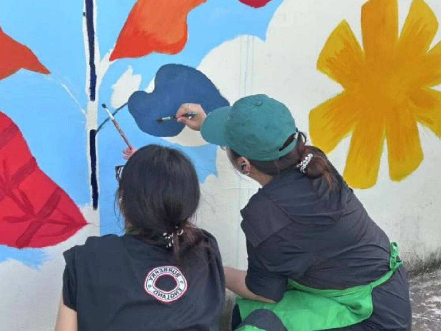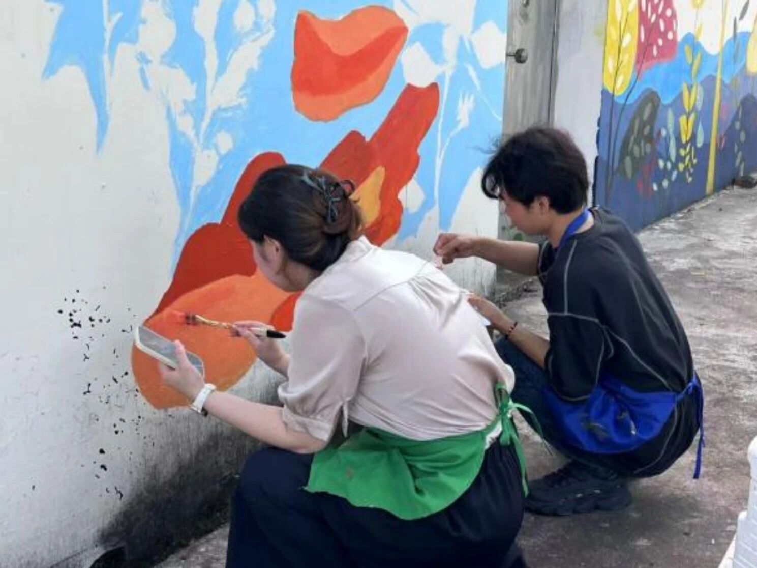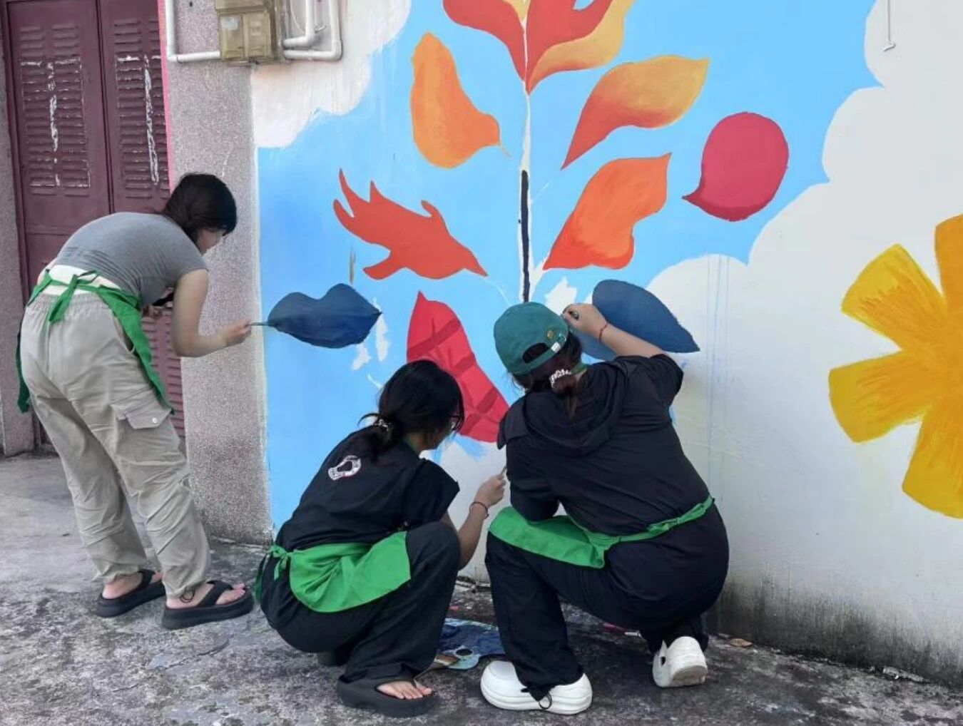 正午刚过,气温便直逼35度,地面蒸腾的热气与头顶的烈日,将墙面烘烤得发烫。即便如此,团队成员依旧迅速投入工作。大家先将调配好的颜料仔细分装,不同色调对应着设计图上的各个区域。戴着草帽、手持滚筒和画笔,开始在已经勾勒好轮廓的墙面上上色。汗水顺着脸颊不断滑落,滴落在颜料盘里,却丝毫没有影响我们的专注。