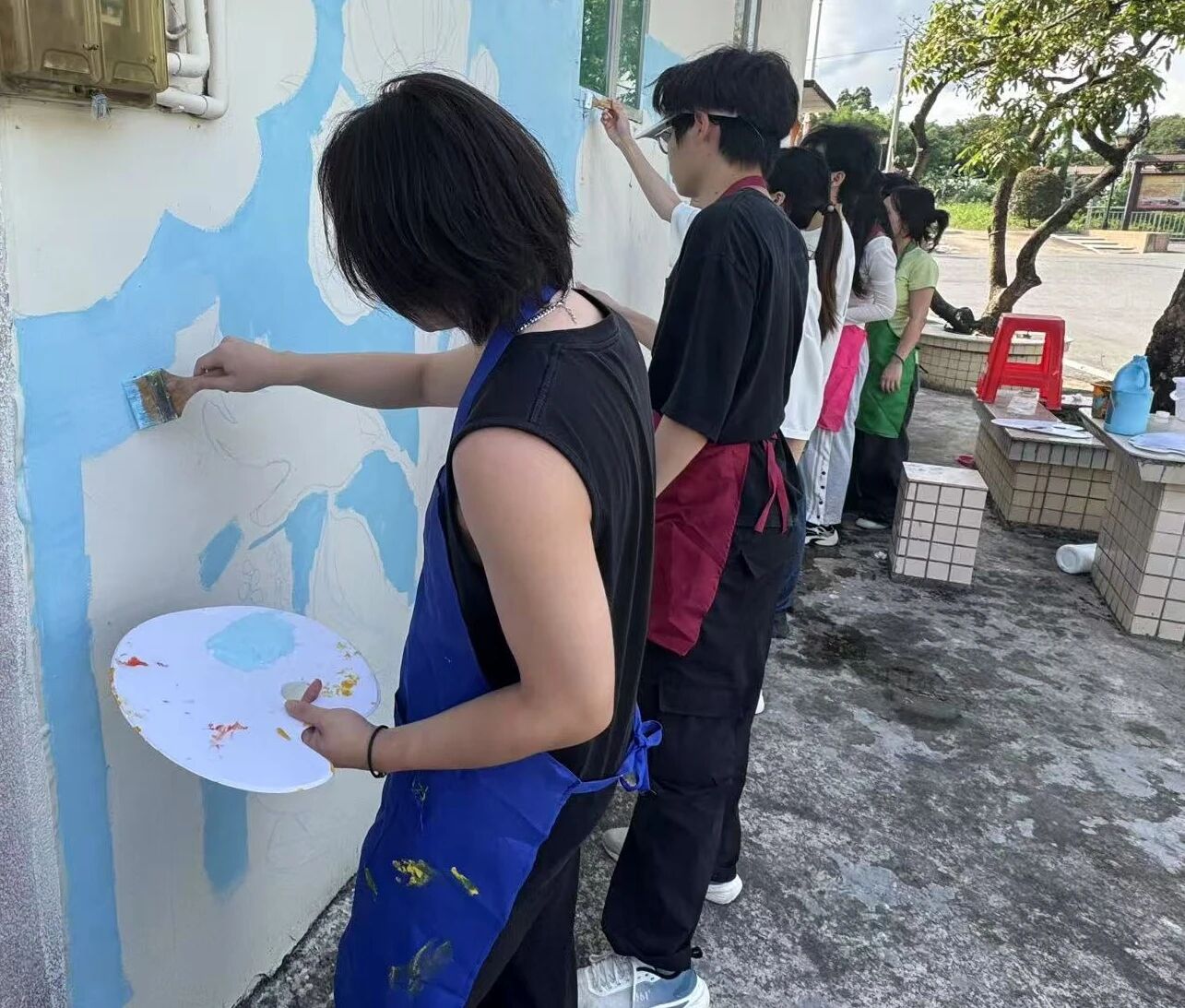 团队成员们分工明确、配合默契。有人负责调配色彩,确保每一种颜料都能精准还原设计稿的要求;有人手持滚筒,细致地为墙面均匀上色;还有人在一旁仔细观察,及时调整色彩的浓淡与衔接。烈日下,汗水浸湿了衣衫,但大家的热情丝毫不减,反而愈燃愈烈。