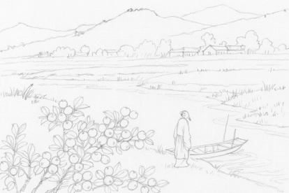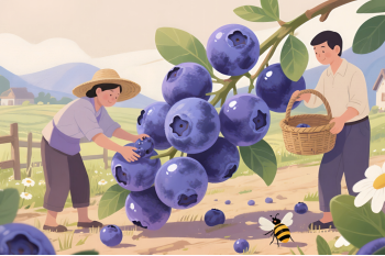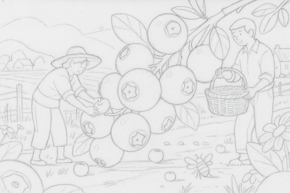 蓝莓园草图——简单勾勒劳作场景升级为水墨蓝莓插画——以传统技法融合现代产业,暗合“农旅融合”规划。