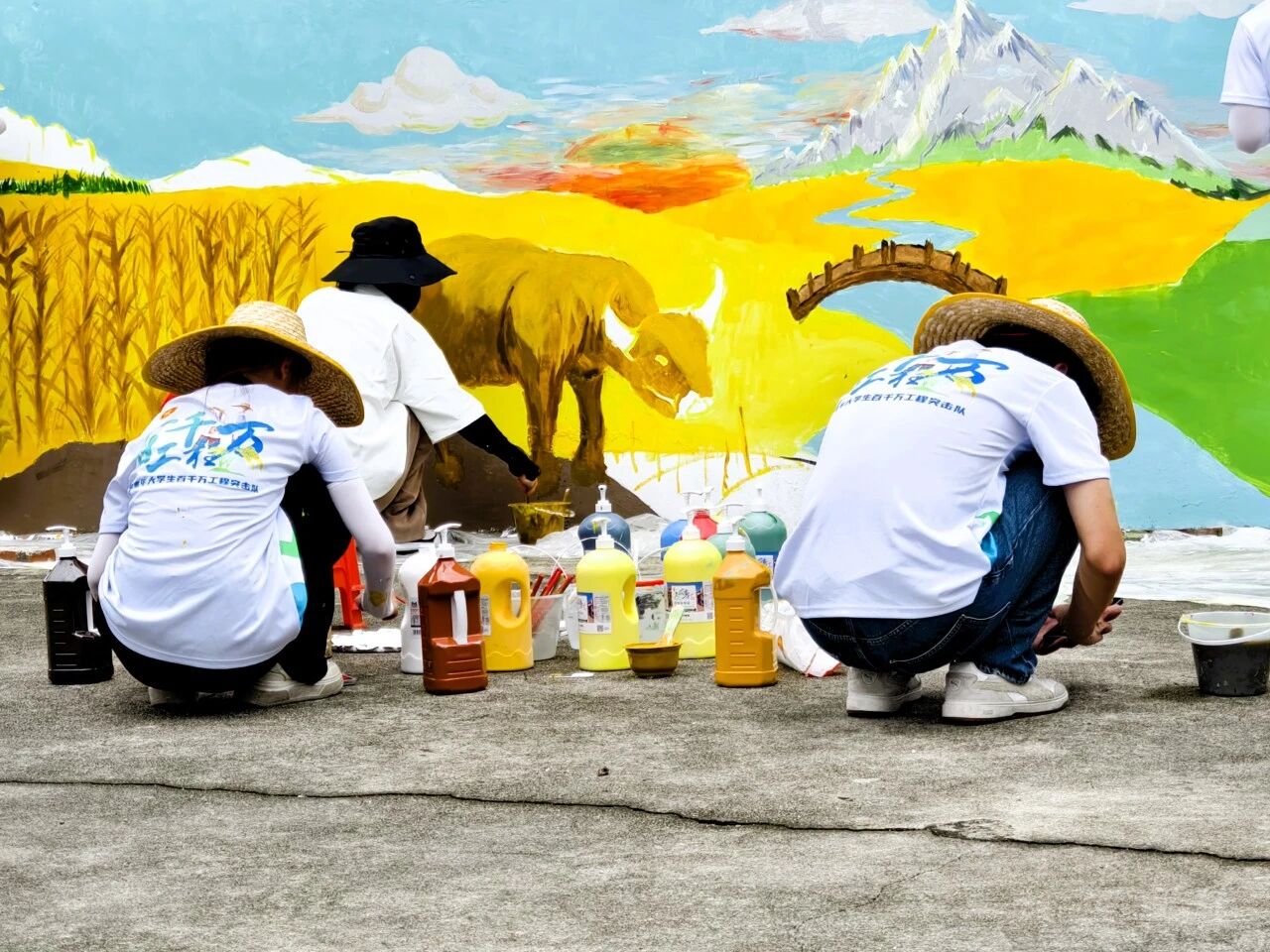 随着太阳升高,气温骤升,连空气都带着灼意。负责上色的队员们蘸着金黄颜料画麦浪,汗水顺着下颌线滴落,金黄的麦浪要调三遍才够饱满。汗水顺着下巴滴在颜料里,晕开一小片深色,大家笑着说这是给麦子加了“营养液”。麦浪的曲线、耕牛的犄角、农舍的窗户,就在一遍遍擦改中,慢慢在白墙上扎了根。等暮色把太阳拖下山,队员们的后背早已湿透,墙上的线条却在余晖里清晰起来。