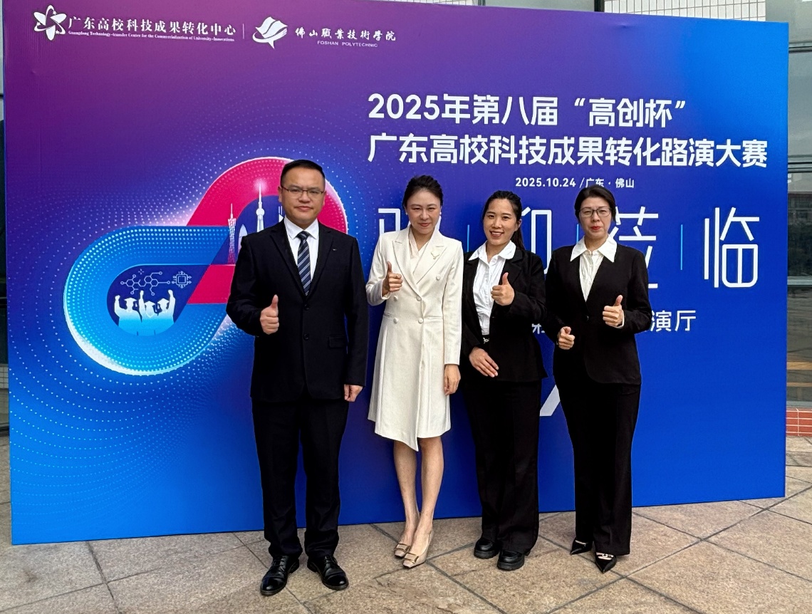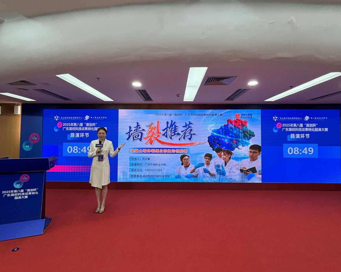 2025年10月24日,由广东省教育厅主办的第八届“高创杯”广东高校科技成果转化路演大赛圆满落幕。本届大赛汇聚了来自全省各类高校的优秀科研与创新项目,竞争激烈、成果丰硕。广州华商职业学院宋欣蕾、李名亮、吴立君、李影四位老师组成的“墙裂推荐”团队凭借创新成果和出色的路演表现,在职教赛道——新材料、节能环保领域中脱颖而出,荣获广东省第四名的优异成绩。