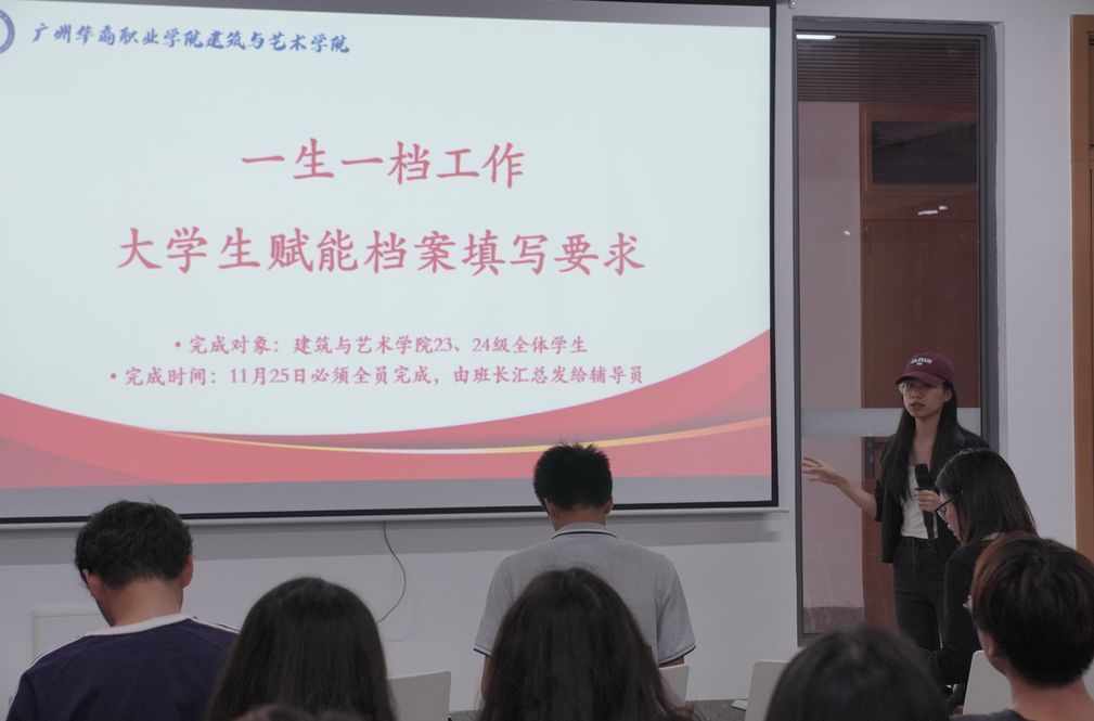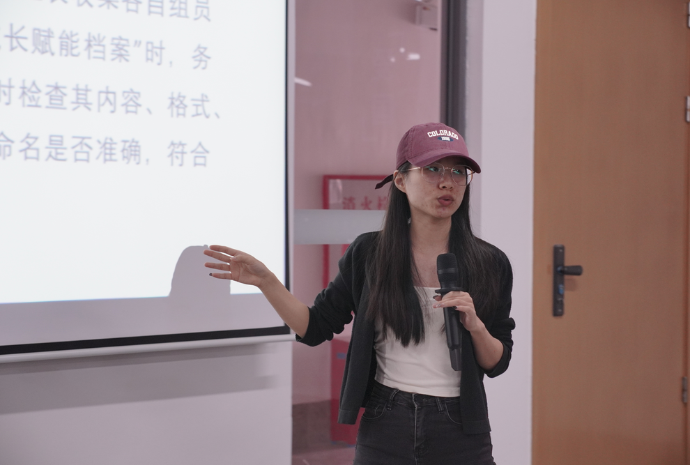 第二部分是由刘冰玲老师部署“一生一档”大学生赋能档案填写工作。刘冰玲老师详细讲述了关于本次档案的填写方法,内容规范和保密工作。由各位班长负责组织收集同学们的各类资料,按照学院规定的时间节点完成收集工作。
