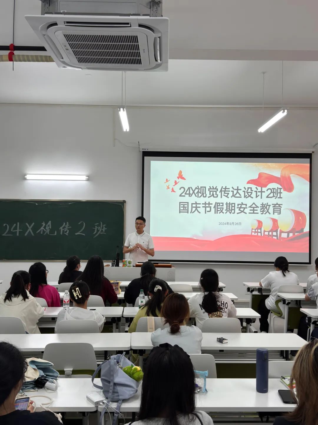 平安度假,欢乐国庆假期随着,国庆假期的临近,24X视传2班组织开展了国庆假期前安全教育班会,辅导员、班主任详细讲解了假期出行安全、个人防护等注意事项,确保同学们度过一个安全愉快的假期。