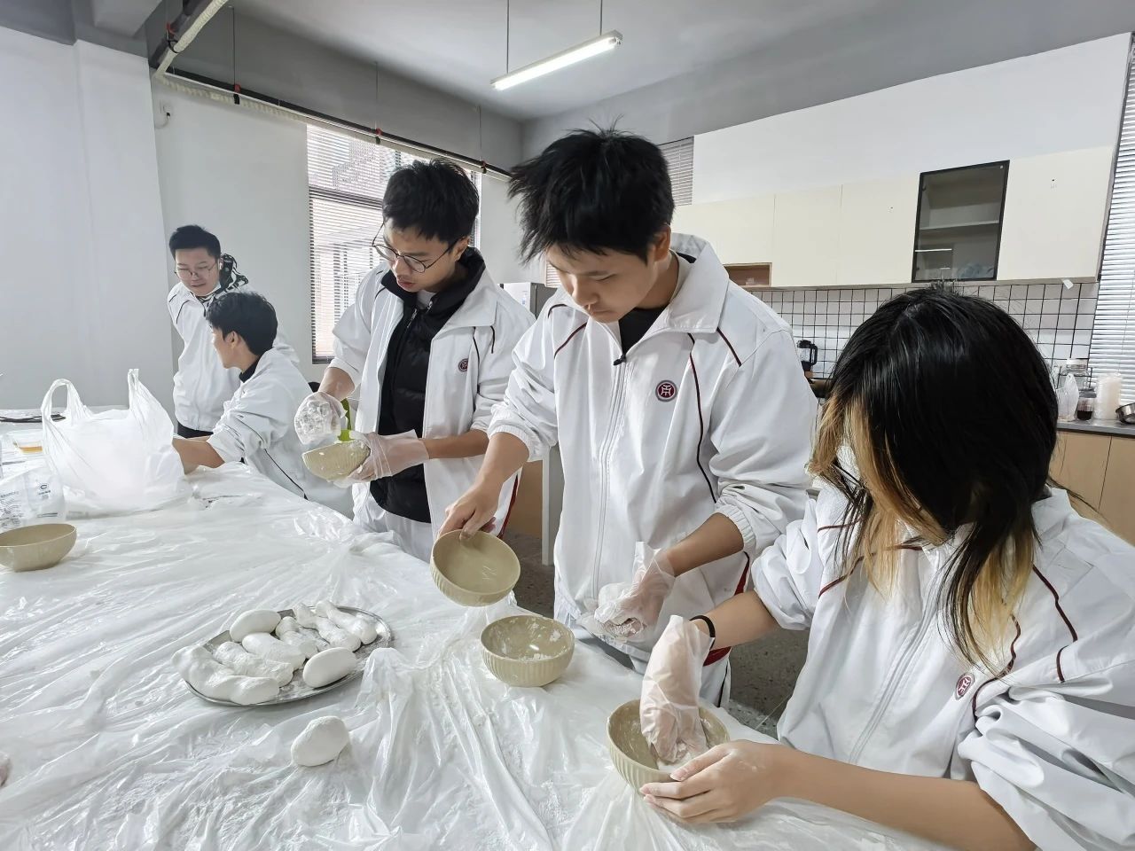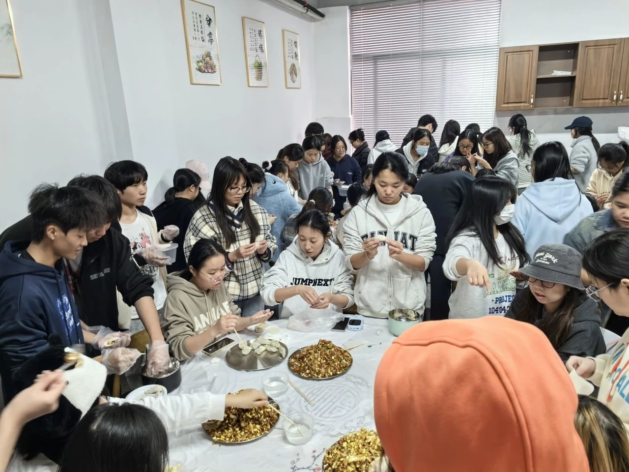 同学们纷纷撸起袖子,化身 “饺子大师”。在一双双巧手的揉搓下,圆润的饺子皮被填上各种馅料,捏出不同形状的饺子,有的手法娴熟,包出的饺子形状美观,褶子均匀;有的则是现学现包,独具特色。当一盘盘形态各异的饺子摆满桌面,现场弥漫着浓浓的家的气息。在寒冷的冬至,热气腾腾的饺子是最温暖的慰藉,它不仅温暖了胃,更温暖了心。
