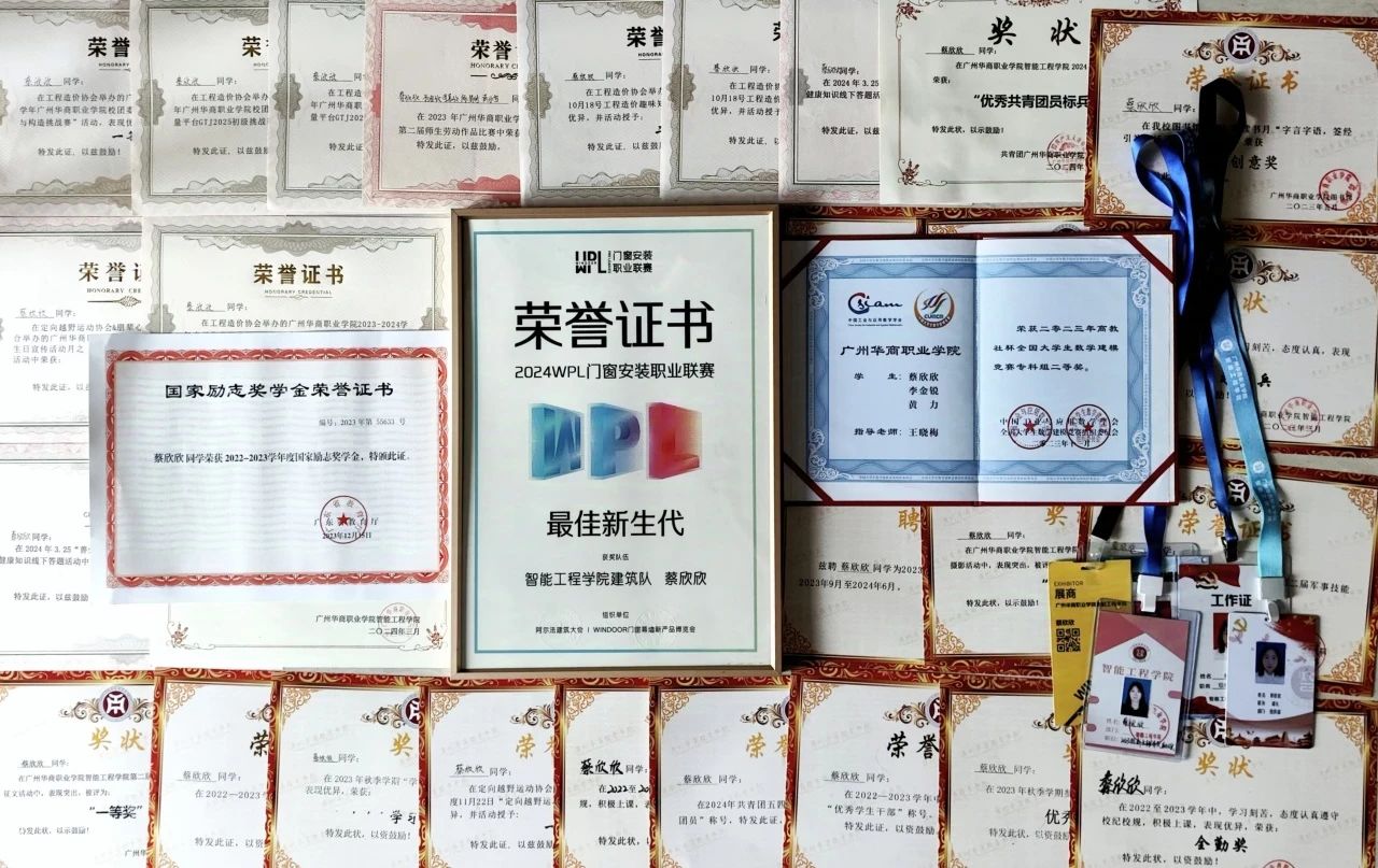 在兼顾学习的同时,踊跃地投身到校内外的竞赛当中,在2023-2024学年获得多项国家级奖项,2024WPL门窗安装职业联赛“全国十强队伍”“最佳新生代”奖项,二零二三年高教社杯全国大学生数学建模竞赛专科组二等奖,省级奖项1项,2023年广东省大学生数学建模竞赛暨全国大学生数学建模竞赛广东省分赛一等奖,以及其他的校级院级奖项30项。