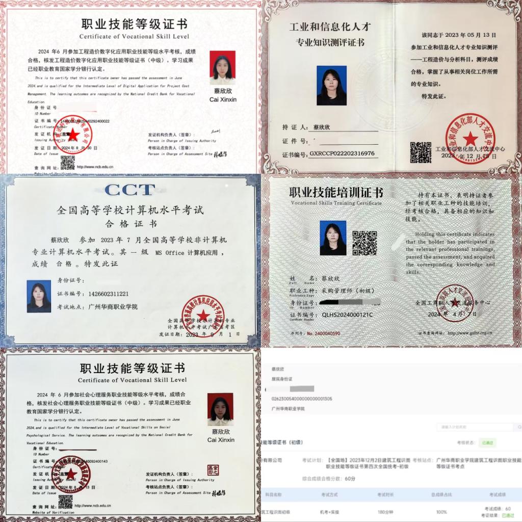 经过两年的学海行舟,综合测评与学业成绩排名均在专业前列,多次获得校奖学金、学习标兵等奖项。同时,积极考取各类专业技能证书,如与专业相关的建筑工程识图职业技能证书、工程造价BIM数字化证书、工程造价与分析等证书,以及其他专业的采购师职业技能证书、1+X社会心理服务中级等级证书等。