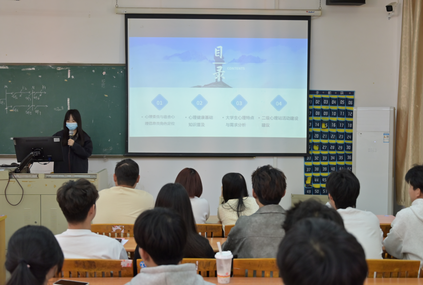 本次培训内容分为五个部分,为心理信息员讲解心理工作内容。促进同学们的身心健康,提升心理素质。
