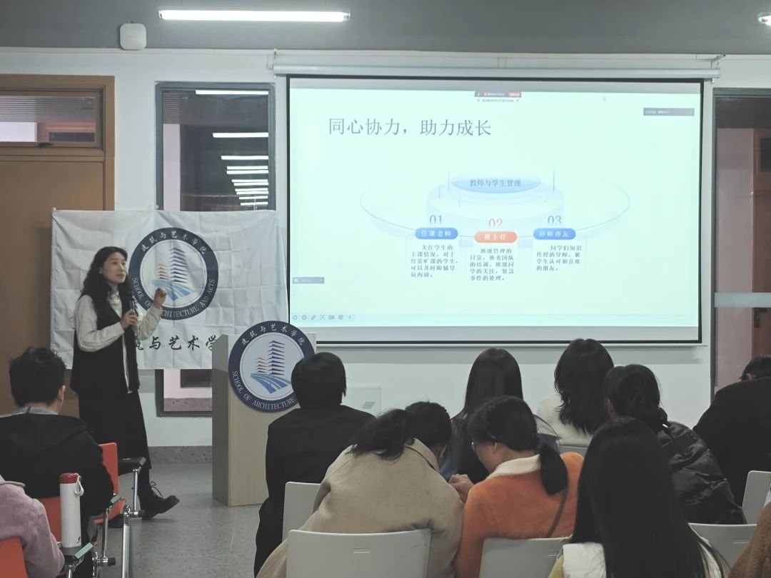 罗姗姗院长详细梳理本学期教学、科研工作目标完成情况,包含专业设置、课程建设、师资队伍建设、人才培养、实训室与实践教学建设、校企合作、社会服务等各项工作成果,展示亮点与成绩。同时,学工副院长张蒙莉从德、能、勤、绩、廉这五个方面对辅导员团队工作成果进行总结,并指出专任教师、班主任、辅导员应同心协,携手共进,为学生的成长与发展提供全方位的支持与帮助。