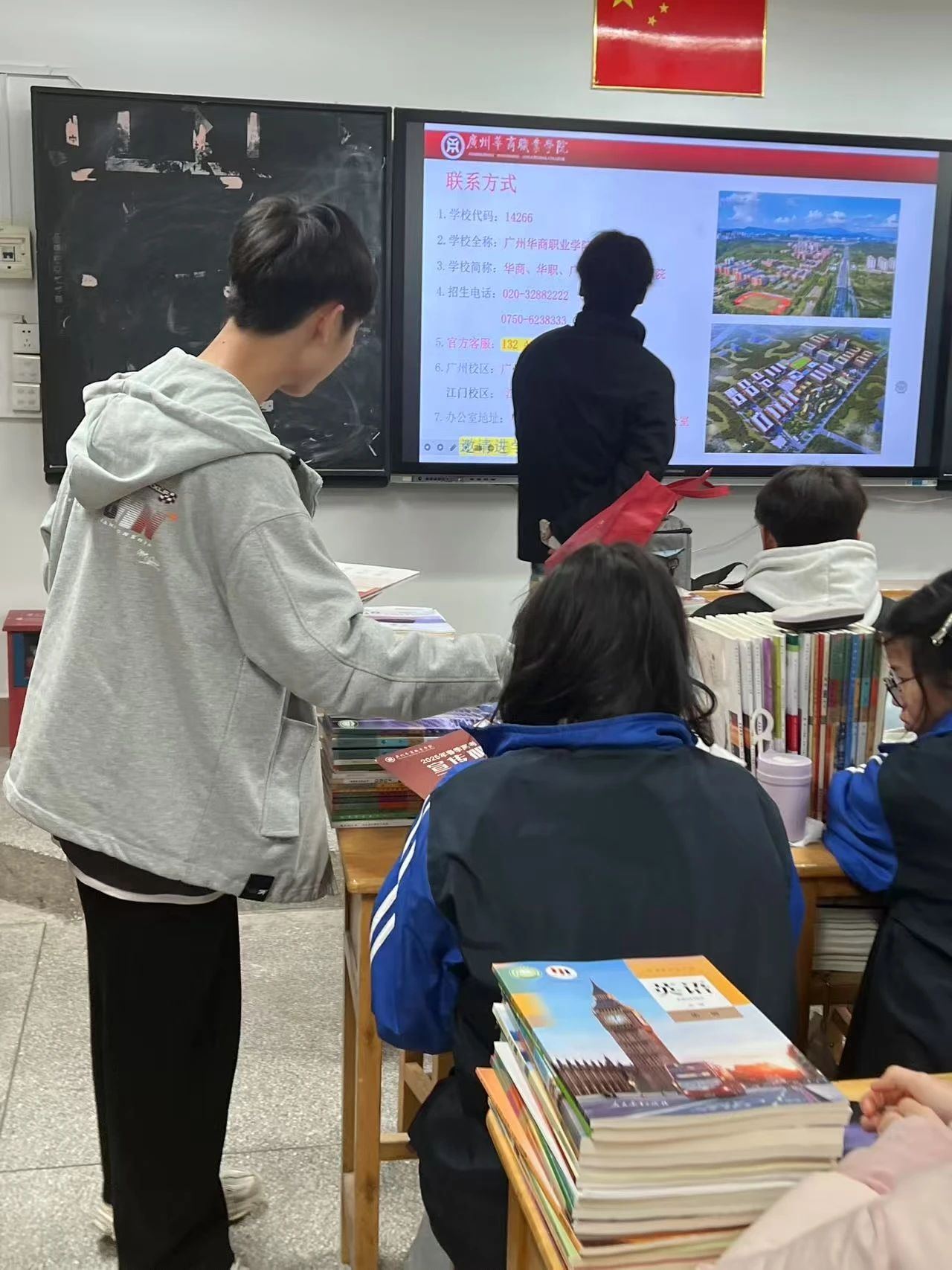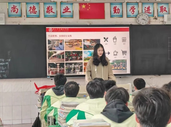 两位同学在老师的精心安排下,进入高三班级进行宣讲。她们详细地介绍了学校的全貌,涵盖各个学科的丰富专业选择,以及在学术研究上的成就和多年的录取情况等。凭借自身的亲身经历,耐心解答同学们提出的各种问题,还毫无保留地向高三学生传授高效的学习技巧和宝贵的志愿填报经验。与此同时,团队成员通过播放精彩的宣传视频、发放内容详实的招生简章等资料,生动地向学弟学妹们展现了广州华商职业学院丰富多彩的校园生活。