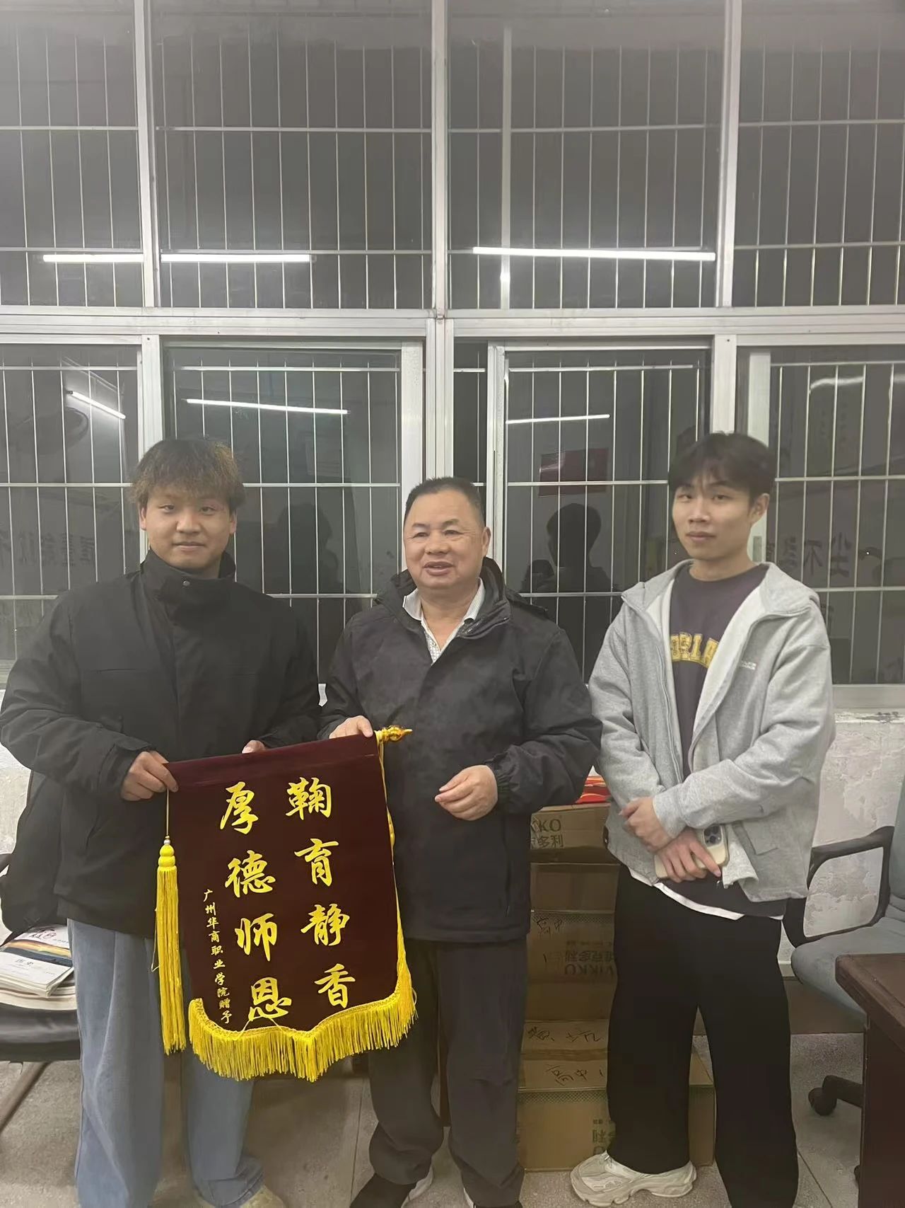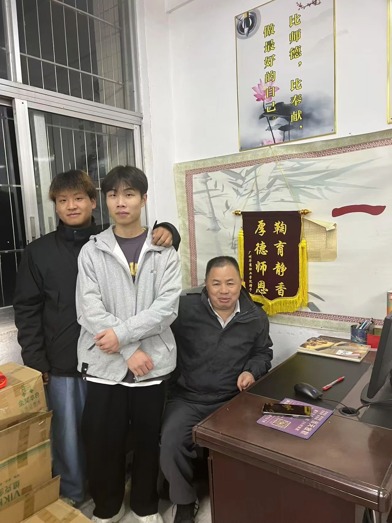 与老师合影留念赠送锦旗后,与高三学子们宣传学校优点答疑解惑,分发学校宣传手册,让学弟学妹更了解我们学校。