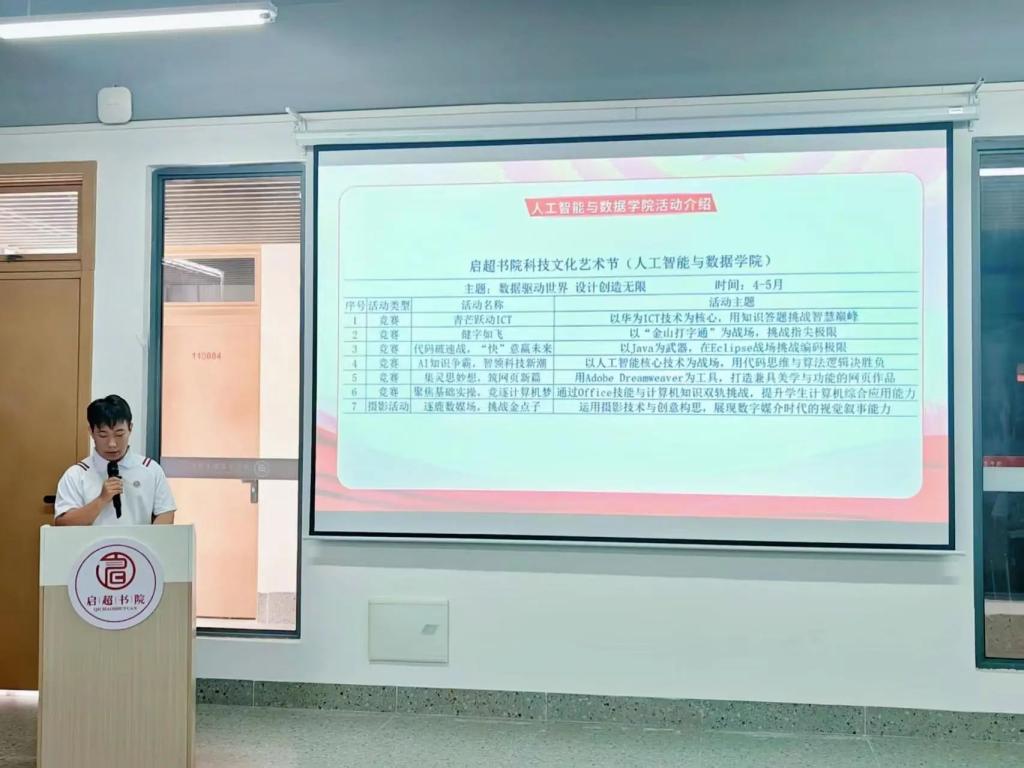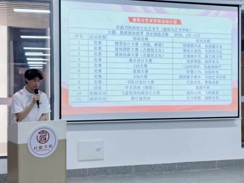 建筑与艺术学院活动负责人吴楚泳、人工智能与数据学院活动负责人戴坚棠依次上台发言。他们在发言中,对本次科技文化艺术节的筹备进程、活动亮点以及预期目标展开了详尽介绍。