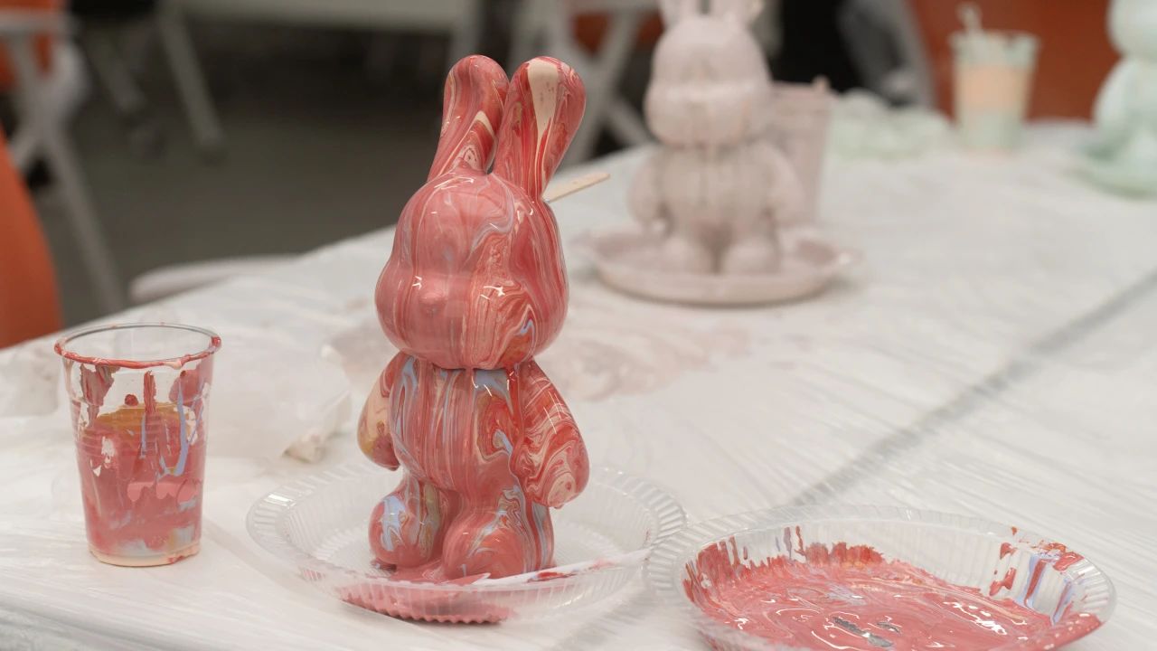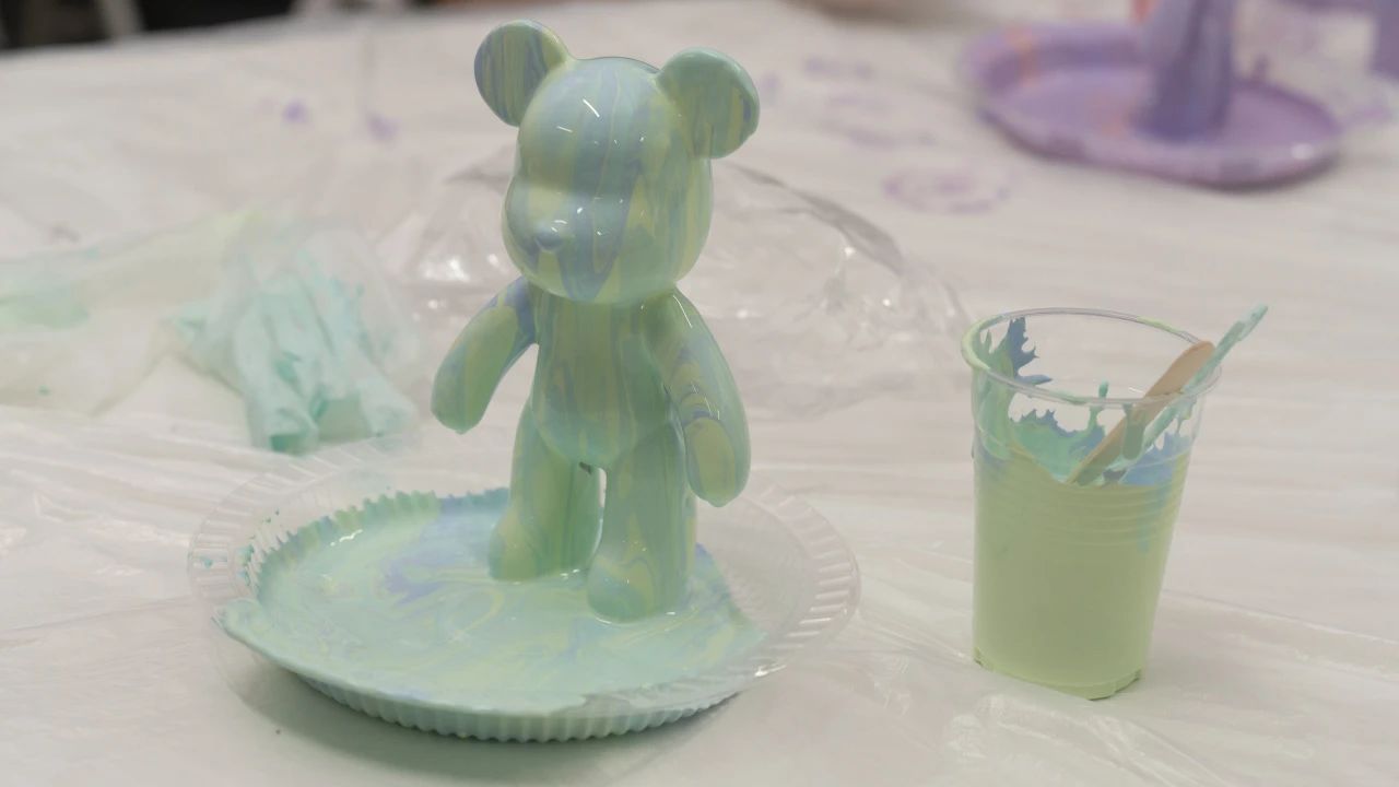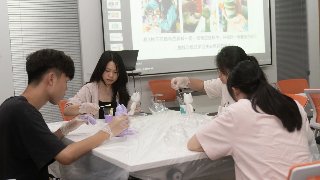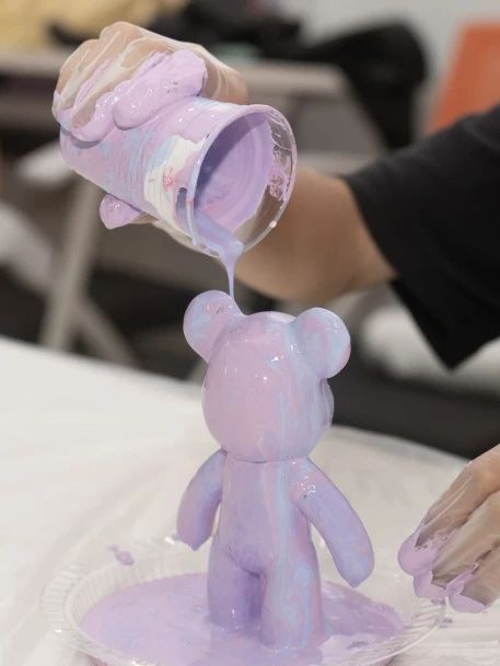 活动开始,由工作人员为参与者介绍了流体艺术的基础知识和创作技巧。随后,同学们开始了自己的创作之旅。他们将不同颜色的颜料层层倒入纸杯中,轻轻搅拌,然后将颜料倒在熊兔白胚上,让色彩自由流淌,形成独特的艺术作品。
