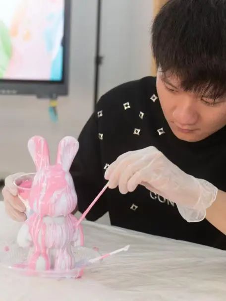 随着颜料的倾泻,色彩在熊兔模型上自由舞动,每一滴颜料都充满了生命力。同学们在轻松愉快的氛围中,体验着流体艺术的魅力,他们或沉思、或欢笑,将内心的情感通过色彩表达出来。