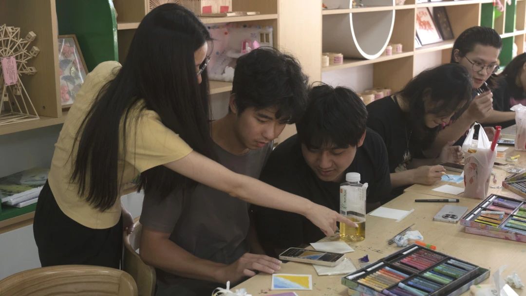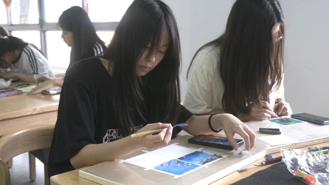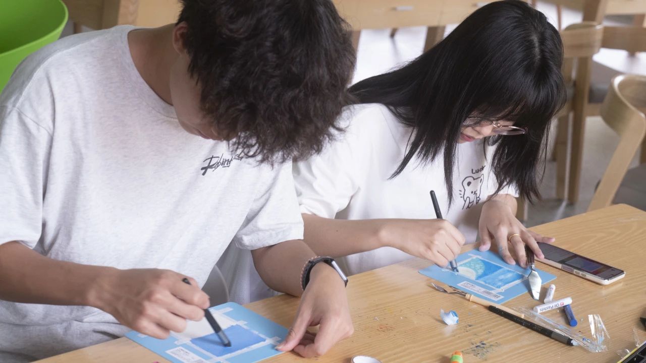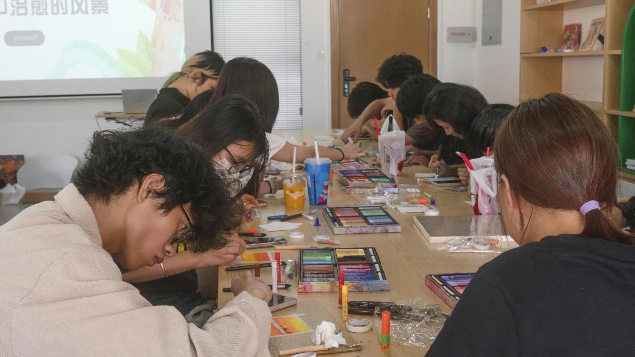 活动现场氛围轻松而专注,轻柔的背景音乐让整个空间充满治愈感。有的同学低头认真涂抹色彩,有的偶尔停笔思考,还有的和身旁的朋友小声交流灵感。随着时间推移,空白的画纸逐渐被温暖的色调填满——蔚蓝的海浪、金黄的麦田、绚丽的晚霞……每一幅画都承载着独特的情绪与故事。